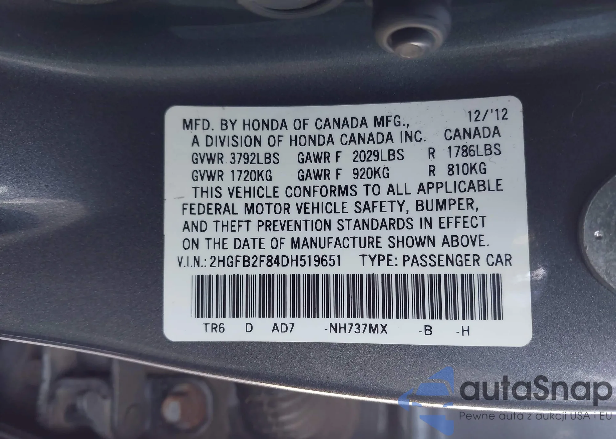 LOT: 43933135 VIN: 2HGFB2F84DH519651