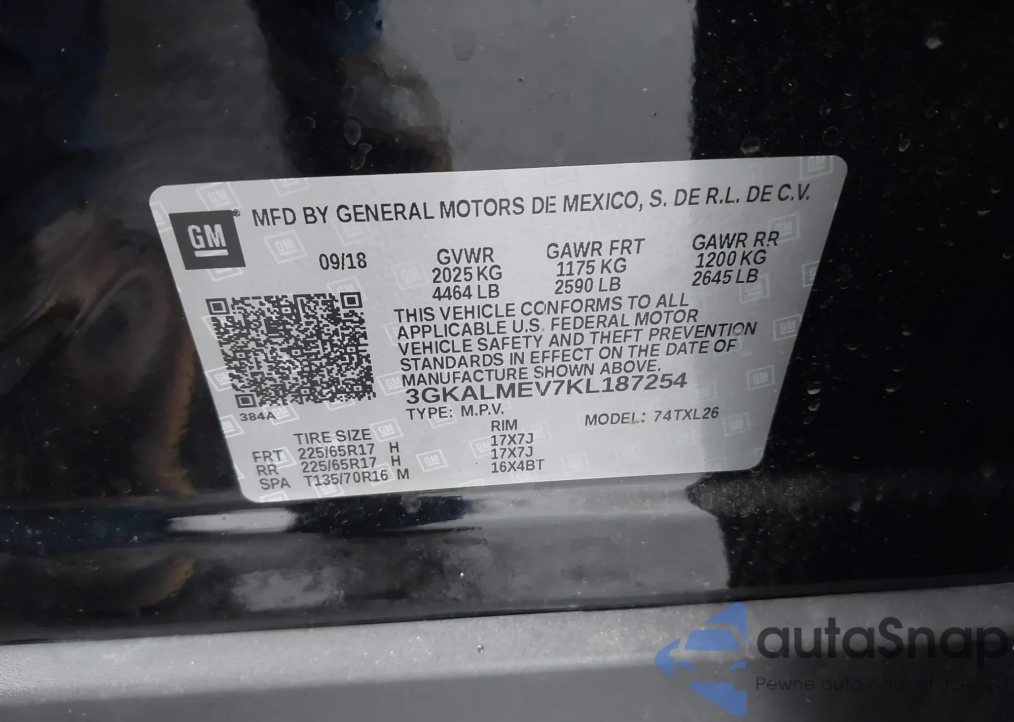 LOT: 43998347 VIN: 3GKALMEV7KL187254