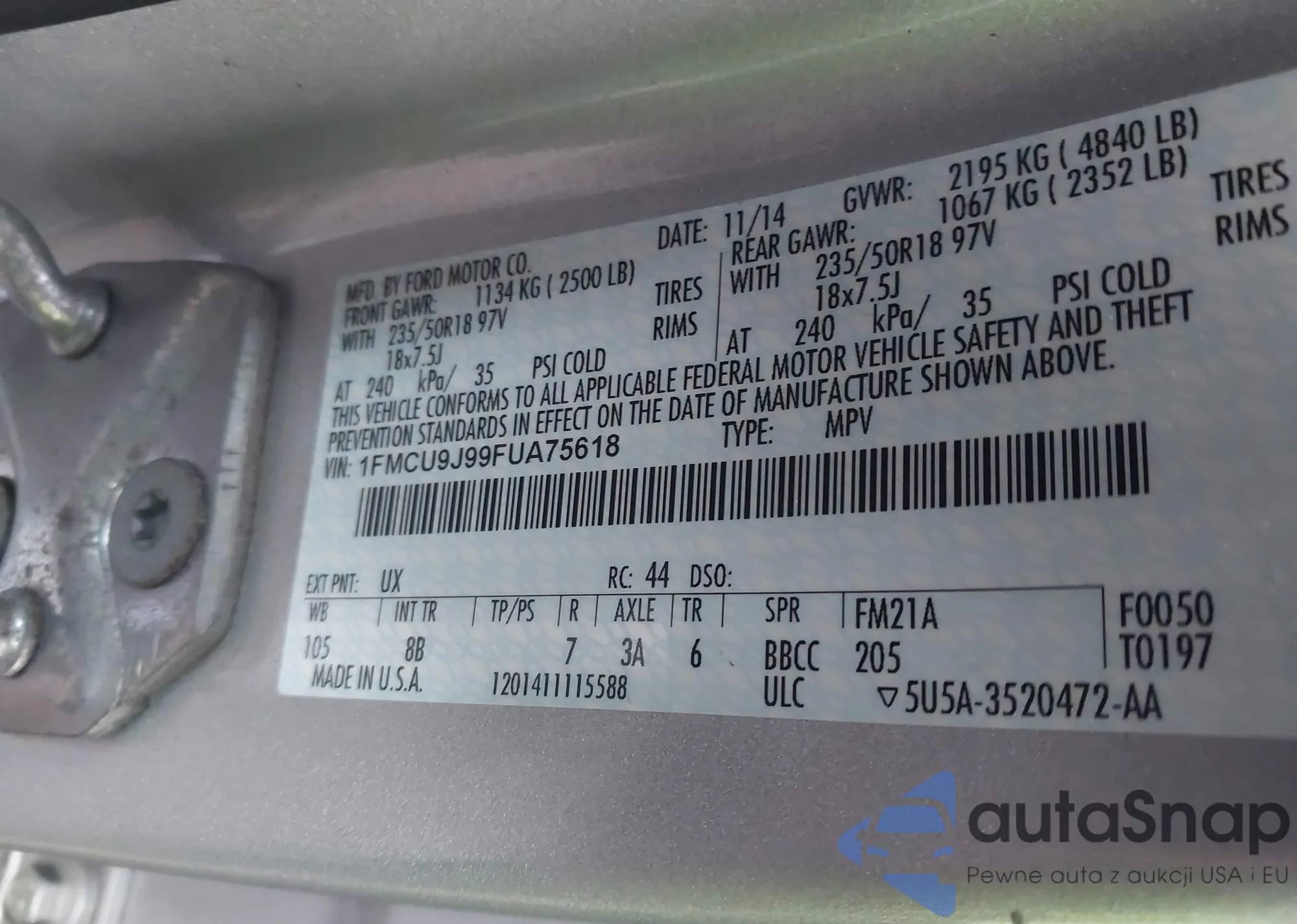 LOT: 44095429 VIN: 1FMCU9J99FUA75618