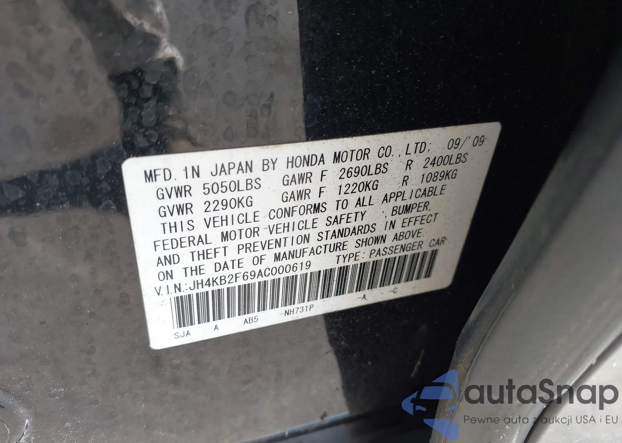 LOT: 44134398 VIN: JH4KB2F69AC000619