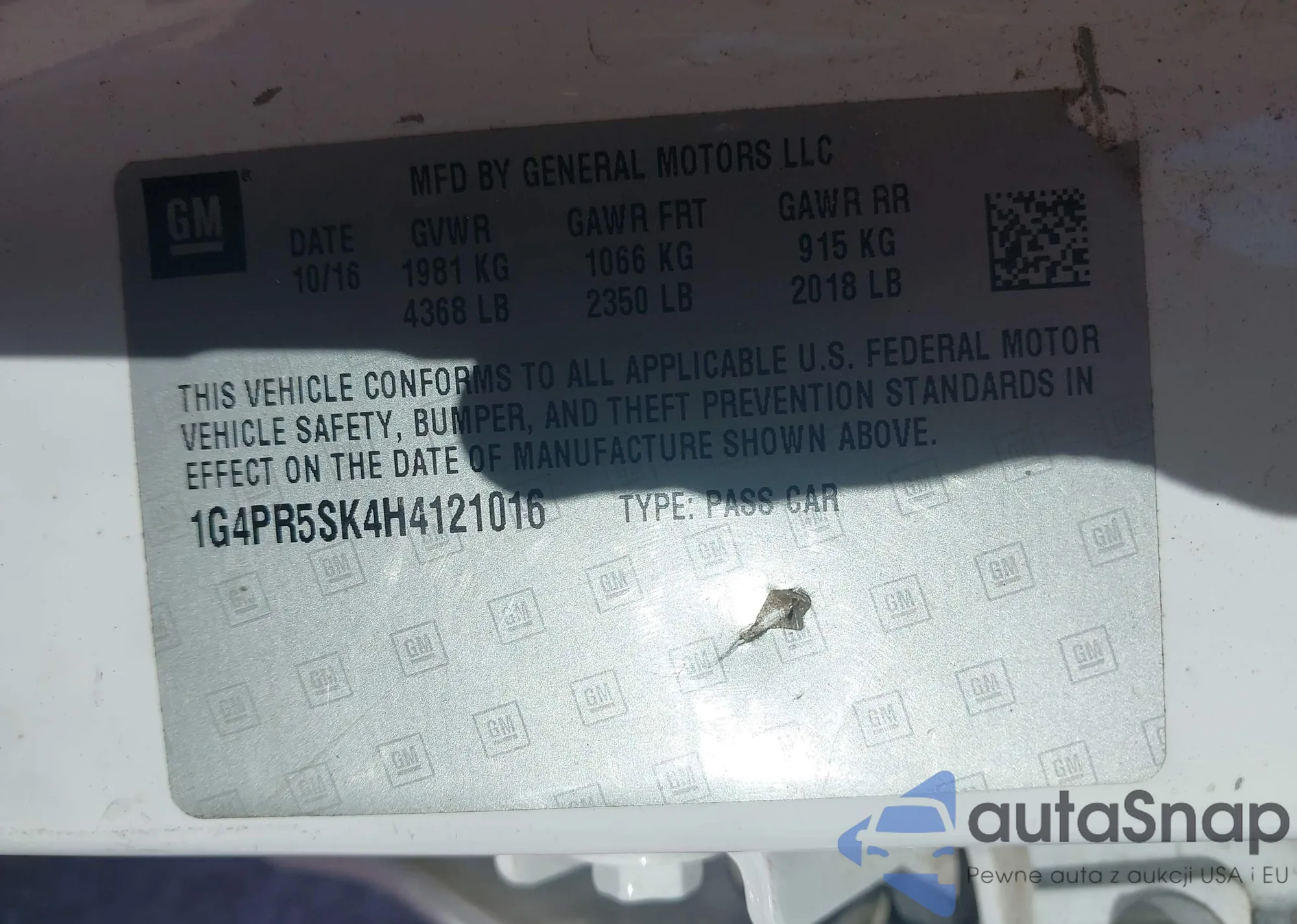 LOT: 43661370 VIN: 1G4PR5SK4H4121016
