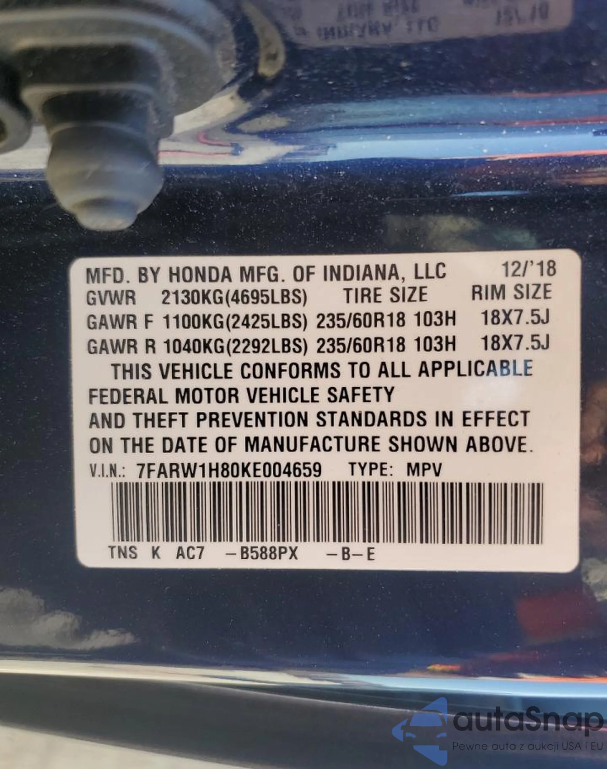 LOT: 92009475 VIN: 7FARW1H80KE004659