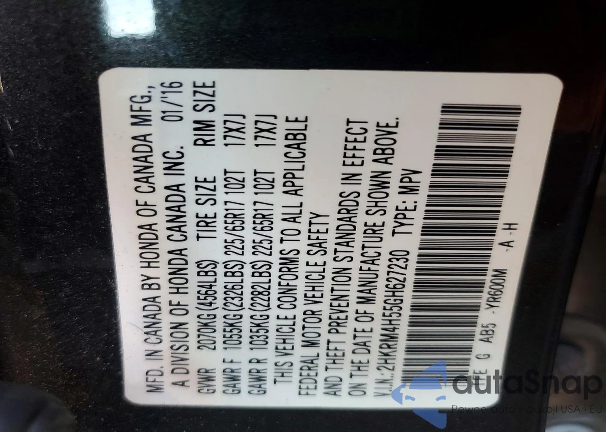 • VIN 2HKRM4H55GH627230