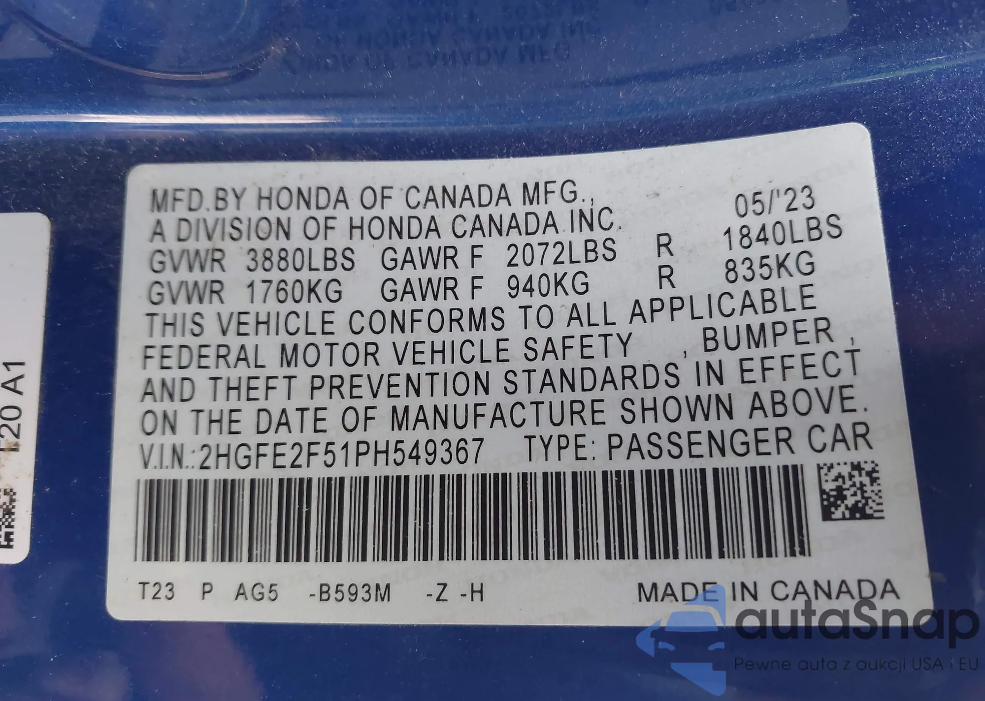 • VIN 2HGFE2F51PH549367