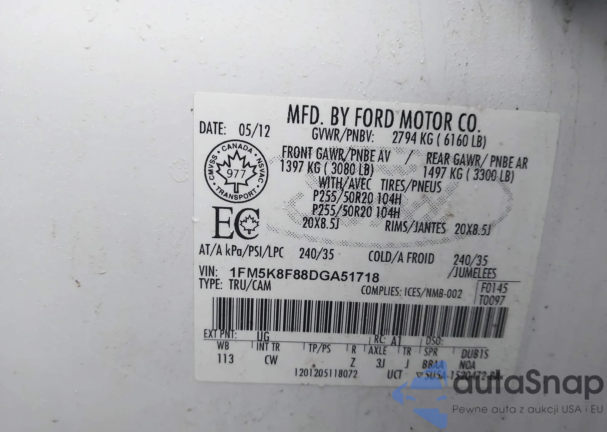 LOT: 43976129 VIN: 1FM5K8F88DGA51718