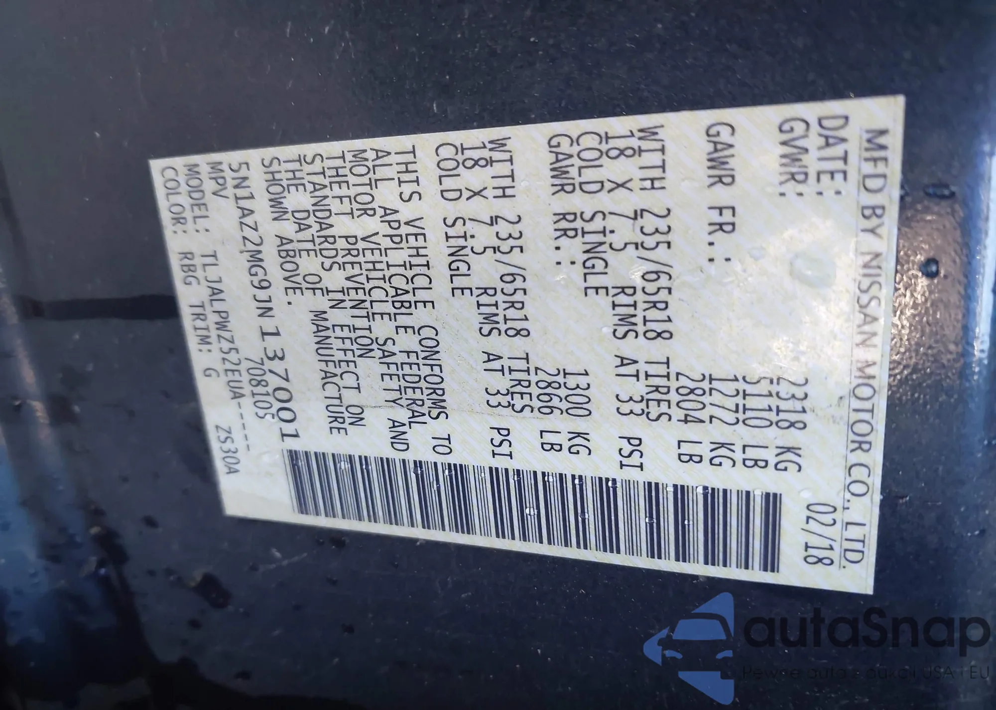 • VIN 5N1AZ2MG9JN137001