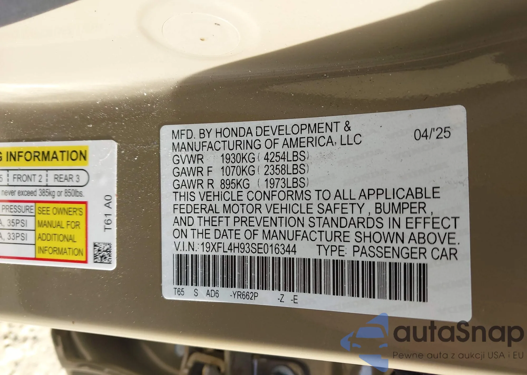 • VIN 19XFL4H93SE016344