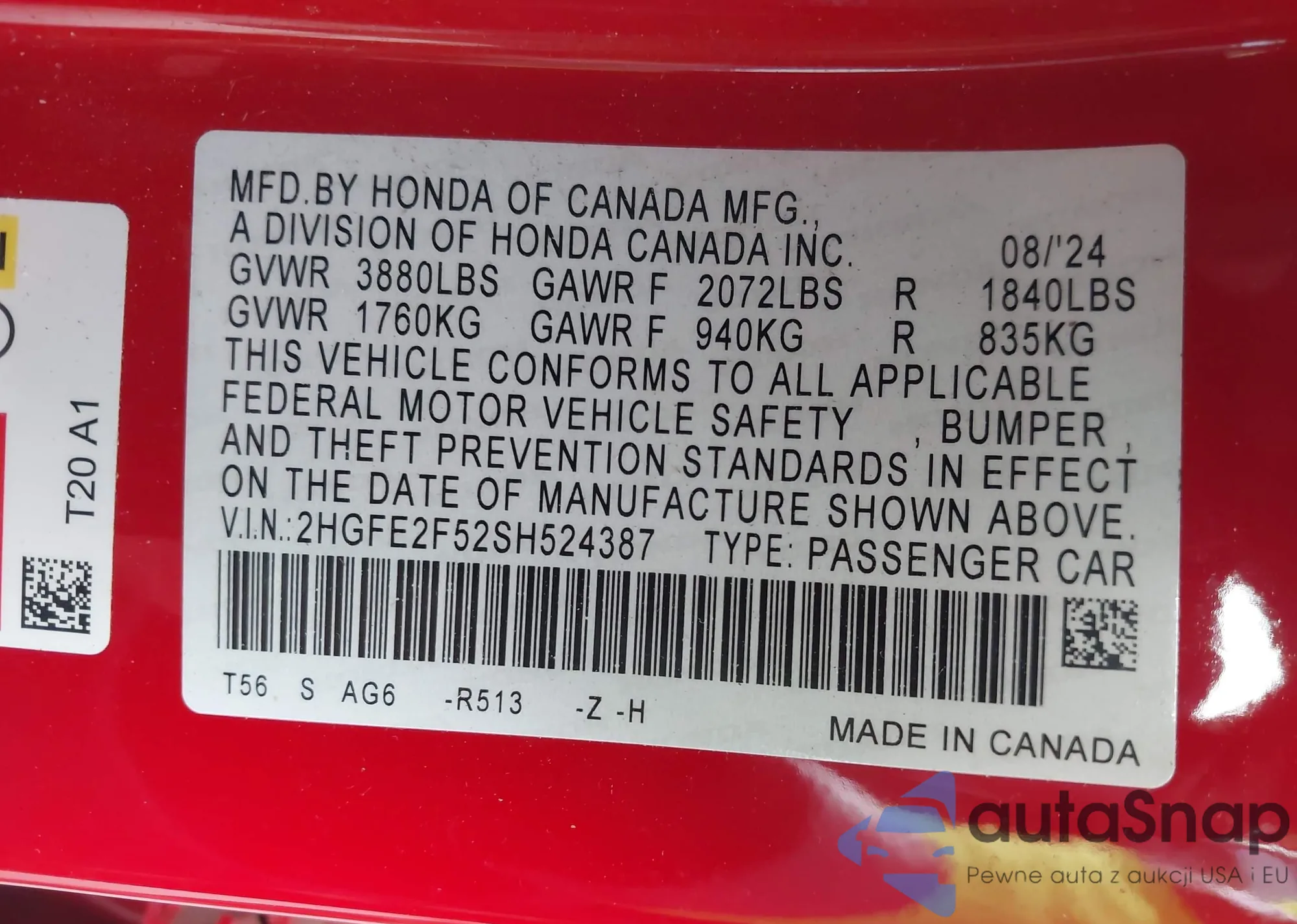 LOT: 43784073 VIN: 2HGFE2F52SH524387