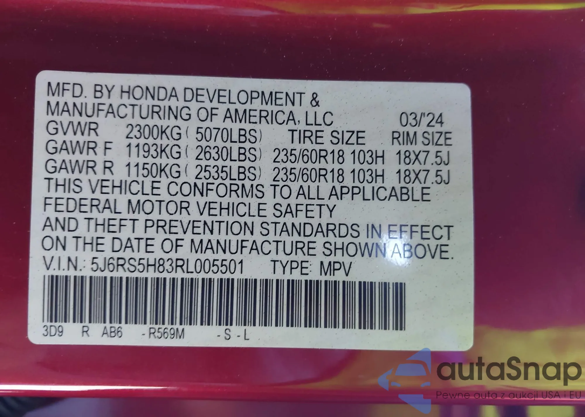 • VIN 5FNYF4H90CB042539