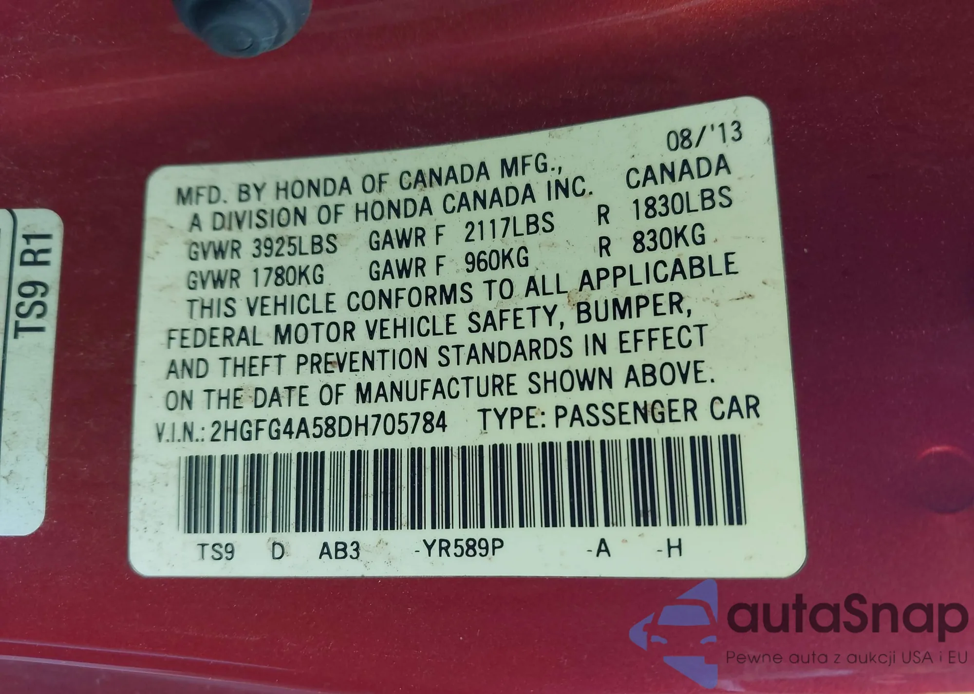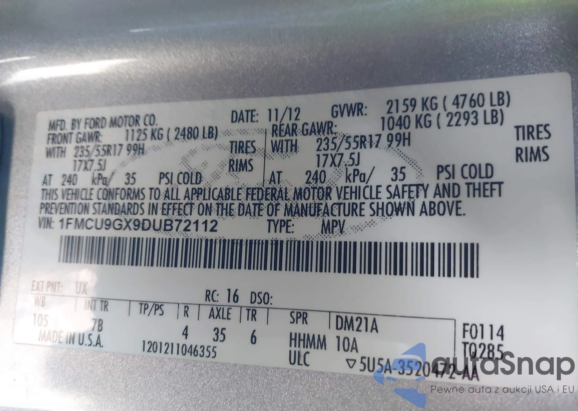 • VIN 1FMCU9GX9DUB72112