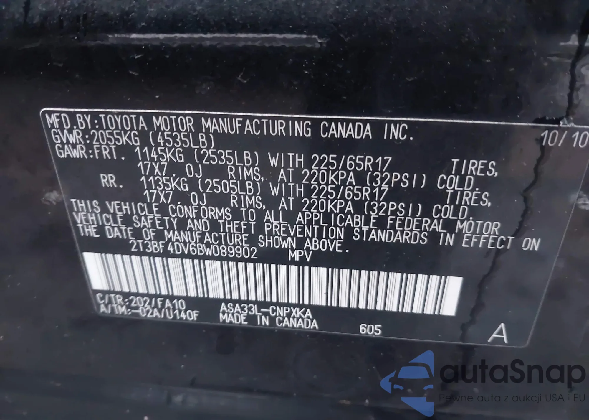 • VIN 2T3BF4DV6BW089902