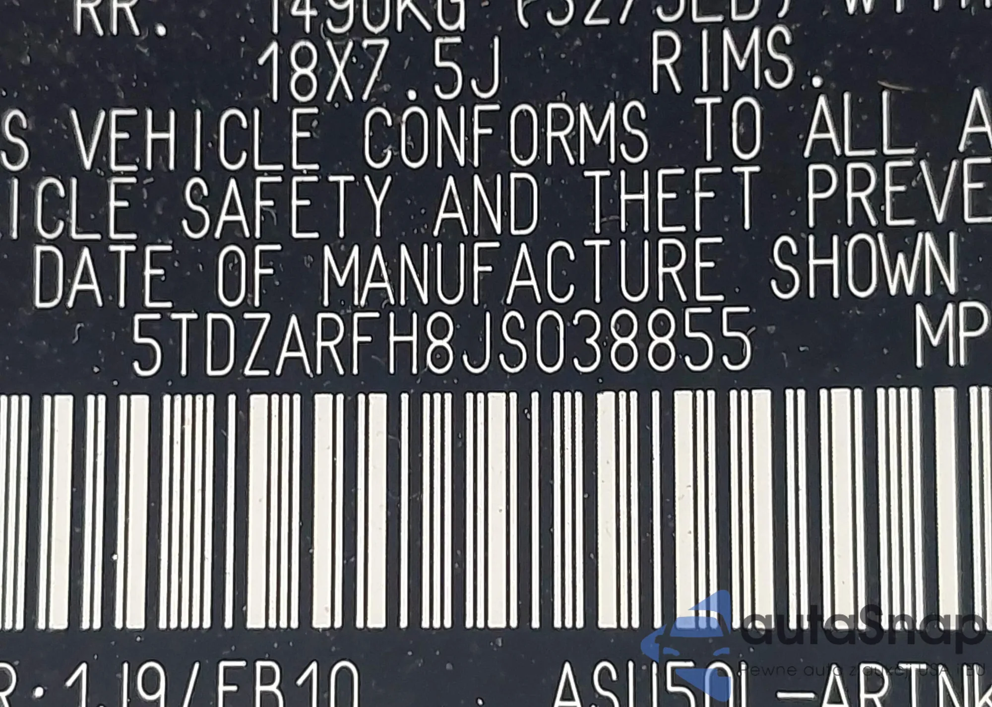 • VIN 5TDZARFH8JS038855