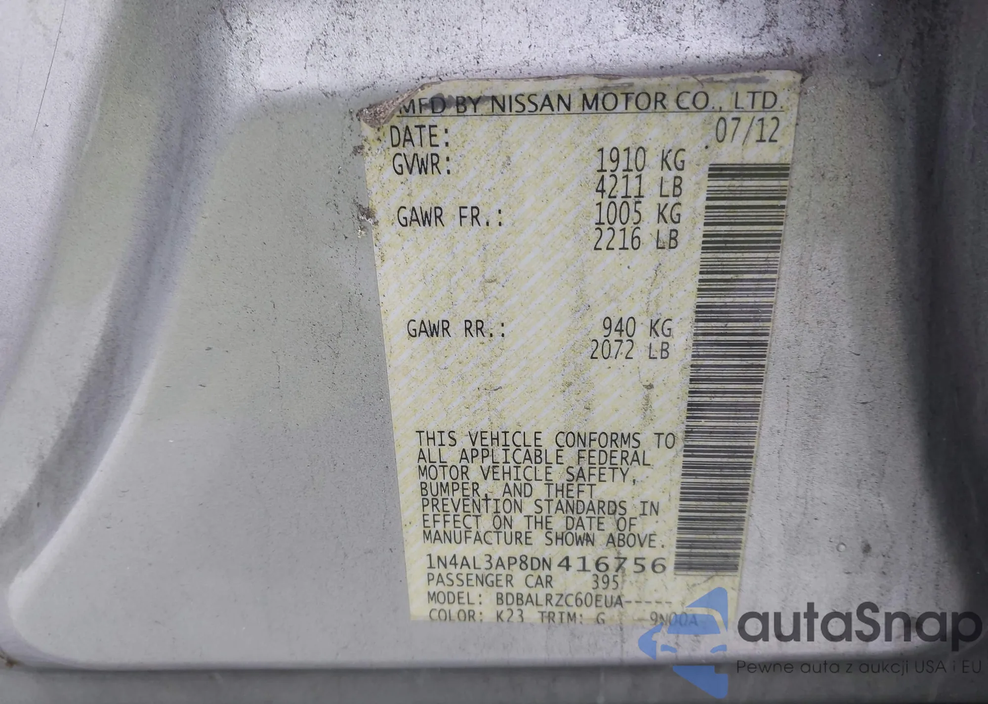 LOT: 43976354 VIN: 5NPEB4AC5DH799220