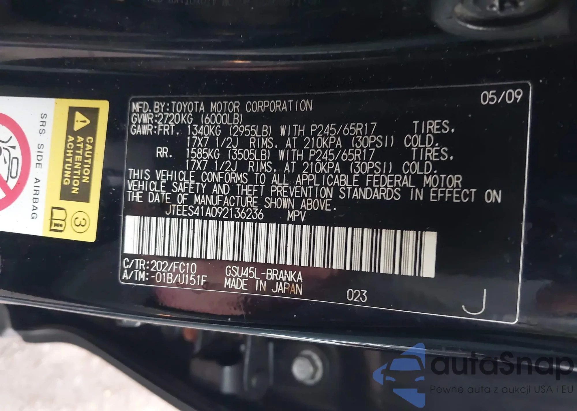 LOT: 44120517 VIN: JTEES41A092136236