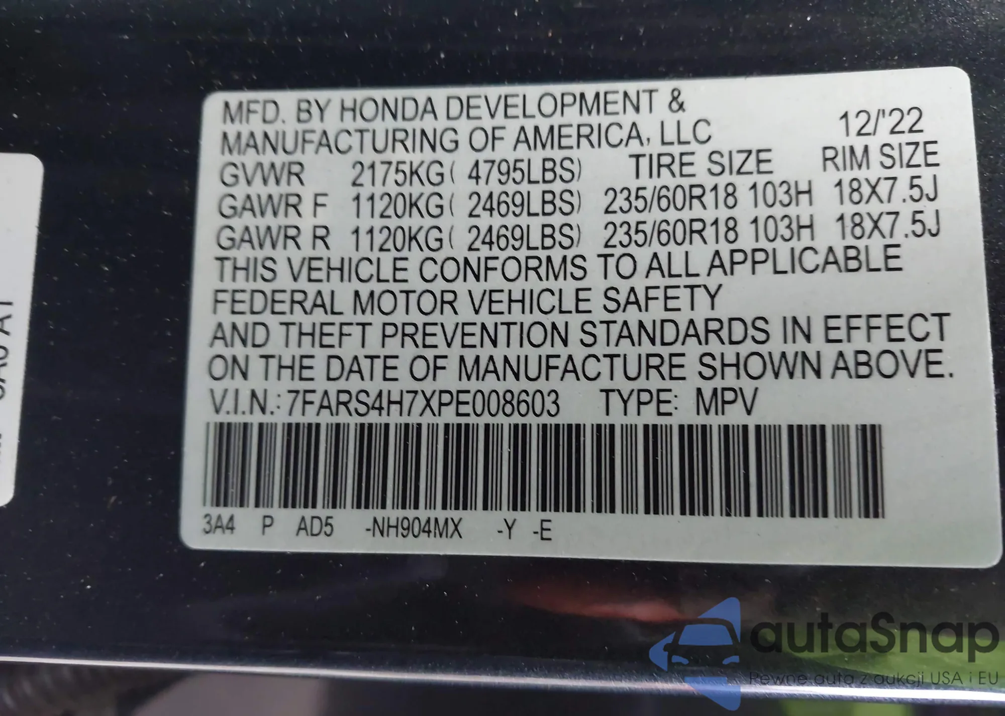 • VIN 2HKRM4H38EH671542