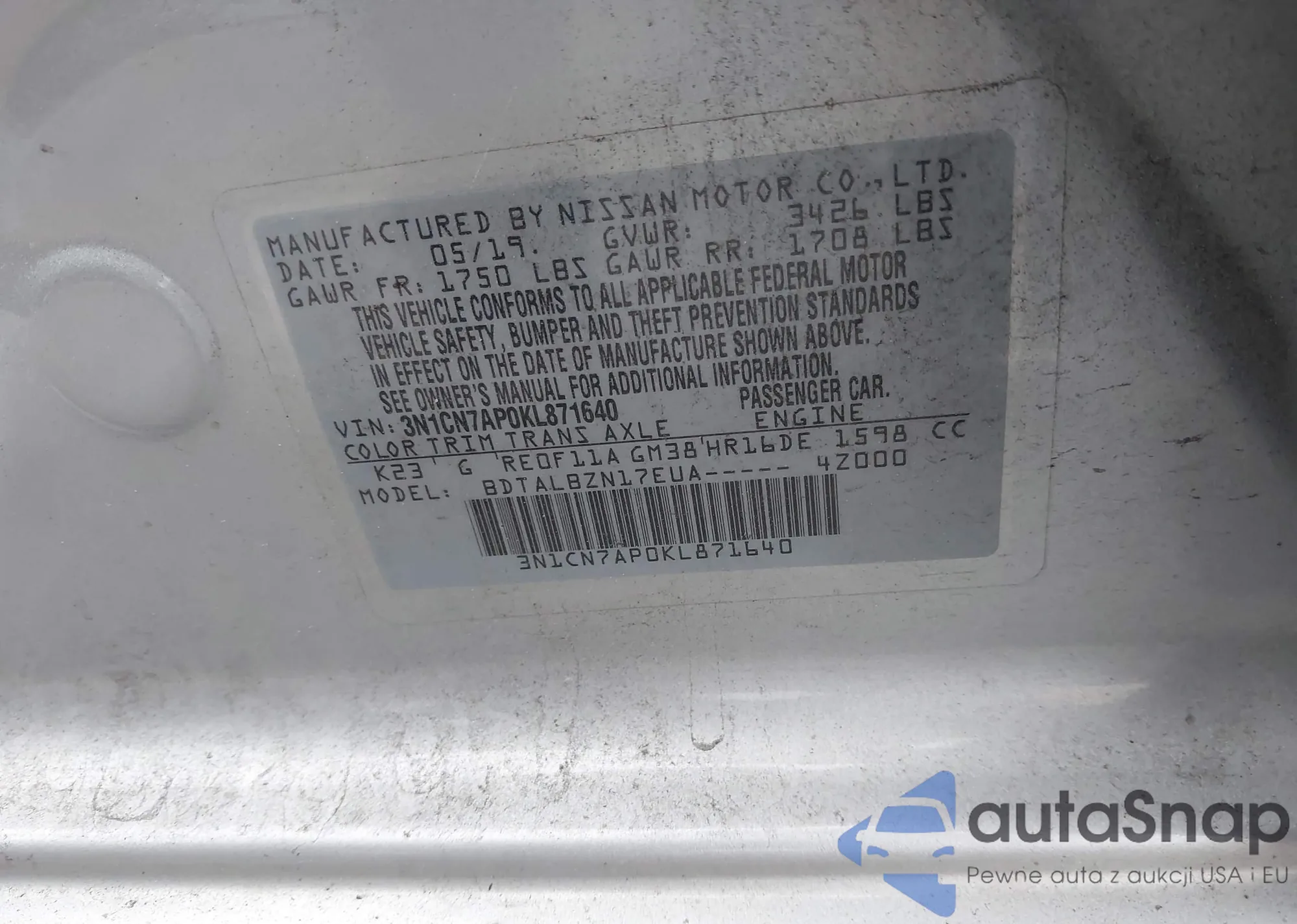 • VIN 3N1CN7AP0KL871640