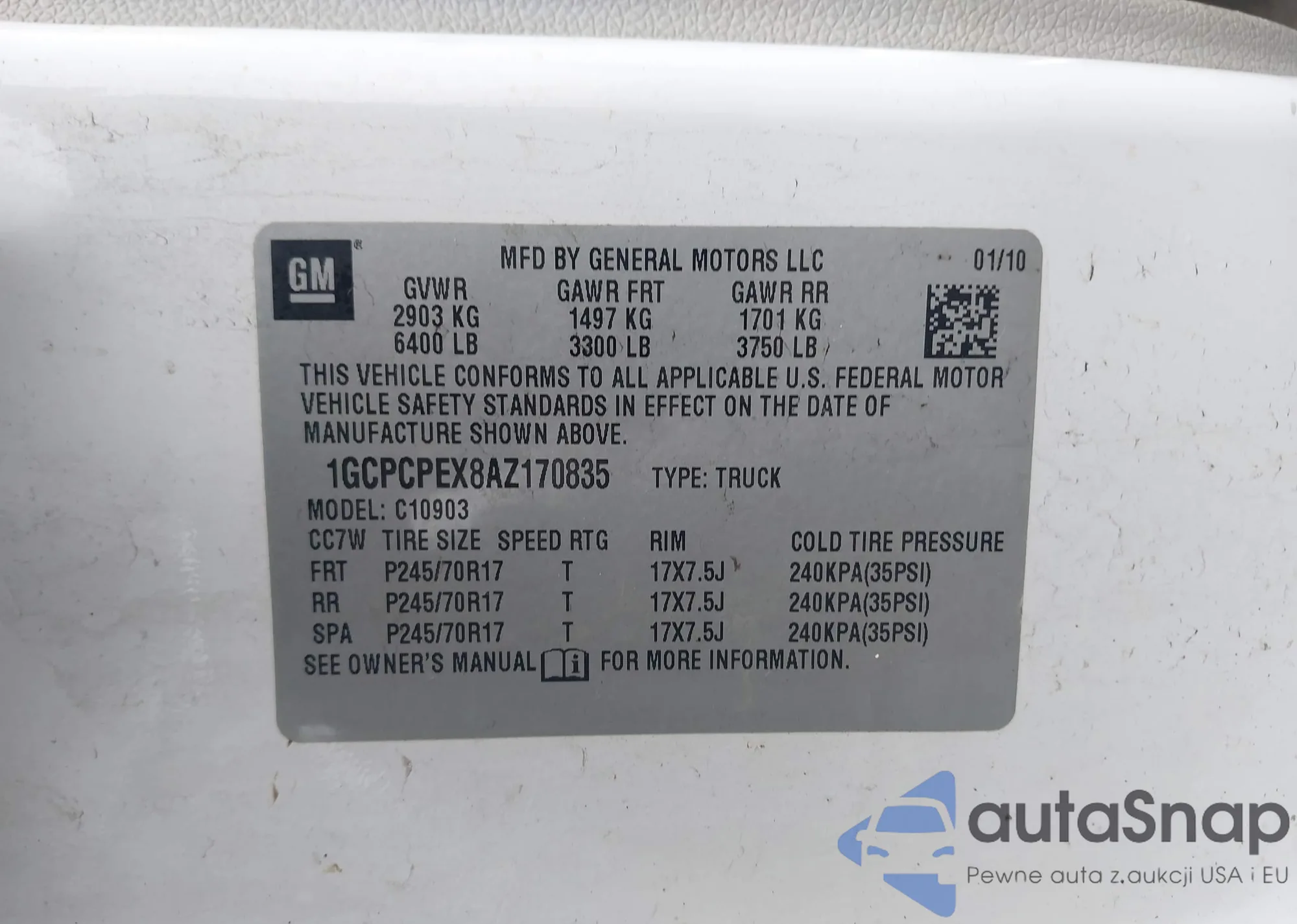 • VIN 1GCPCPEX8AZ170835