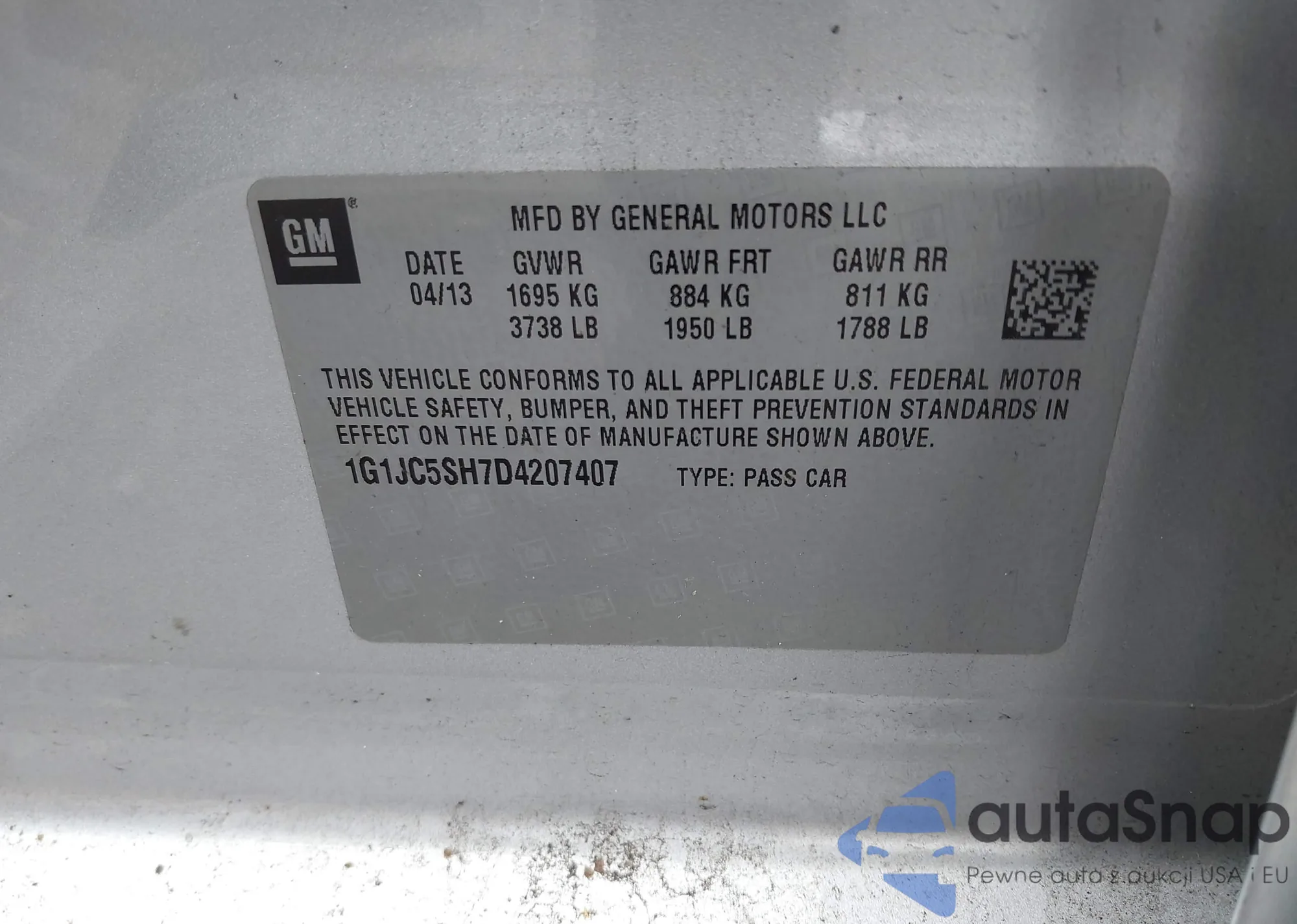 LOT: 43965455 VIN: 1G6AG5RX3D0161657