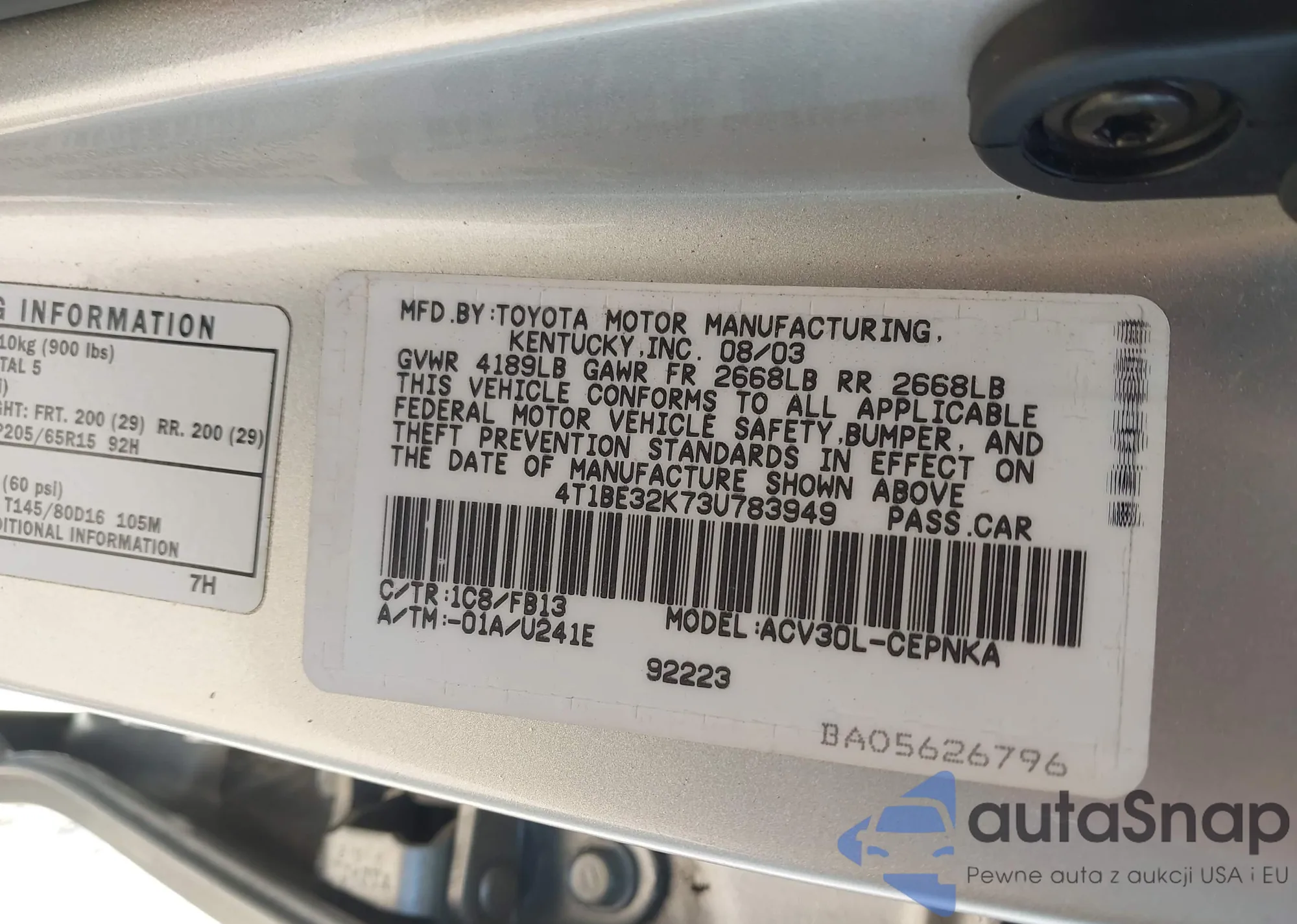 • VIN 4T1BE32K73U783949