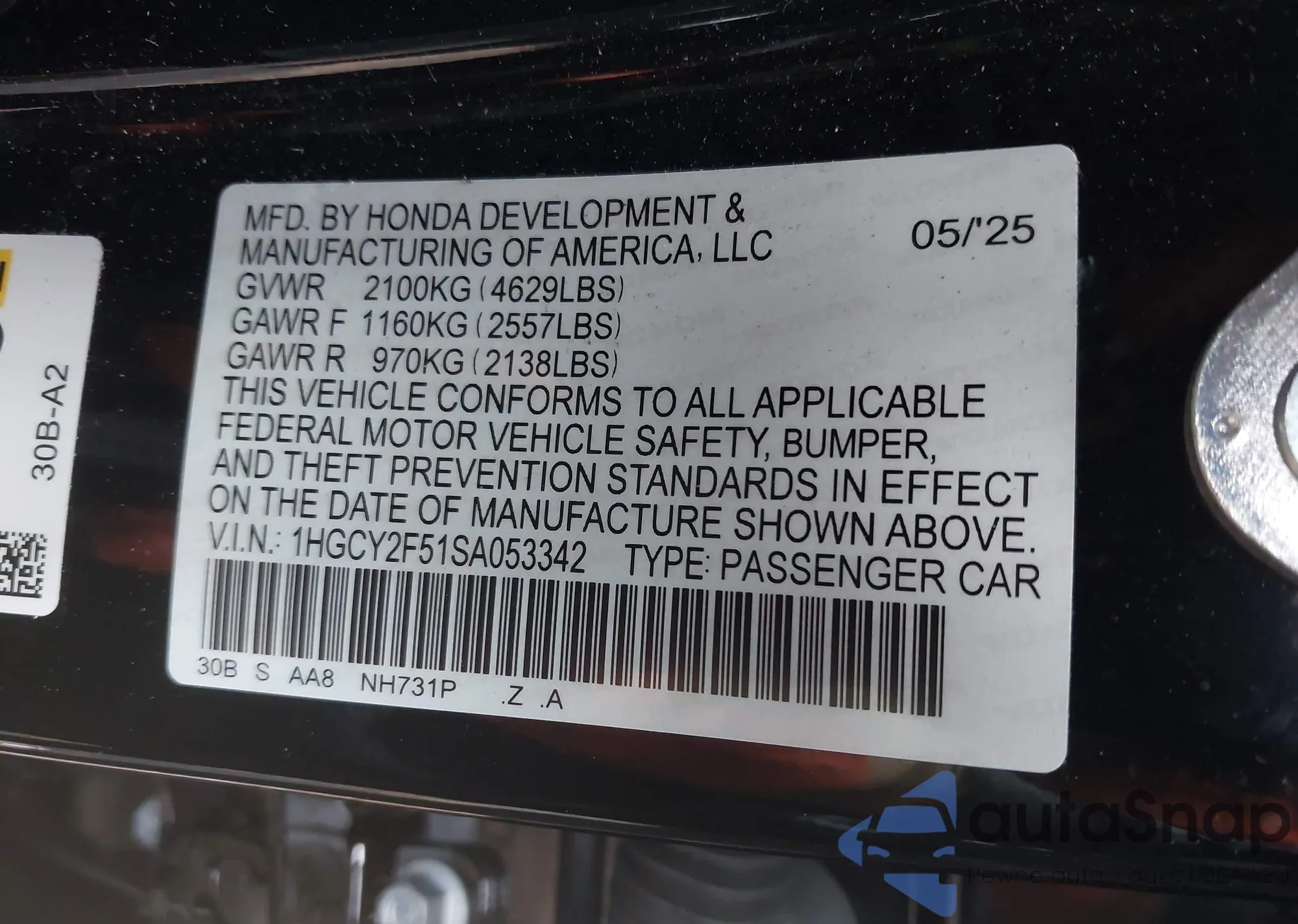 • VIN 1HGCY2F51SA053342