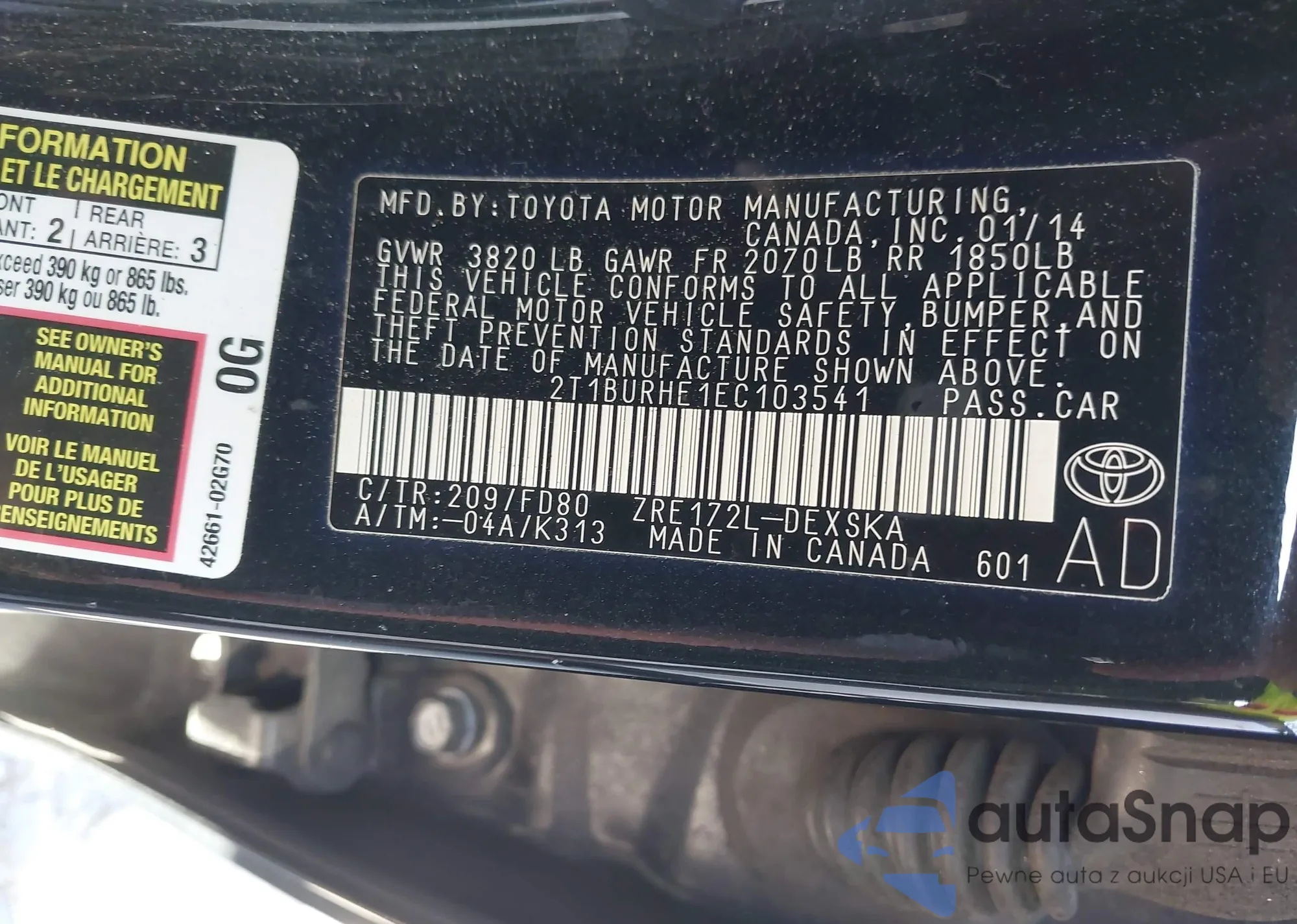 LOT: 43694036 VIN: 2T1BURHE1EC103541