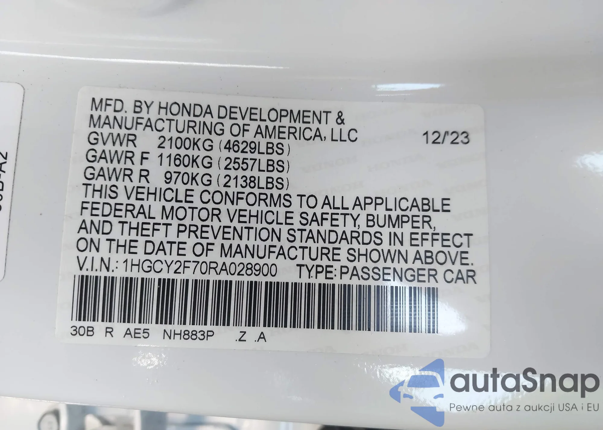 LOT: 44069634 VIN: 2HGFG21577H710628