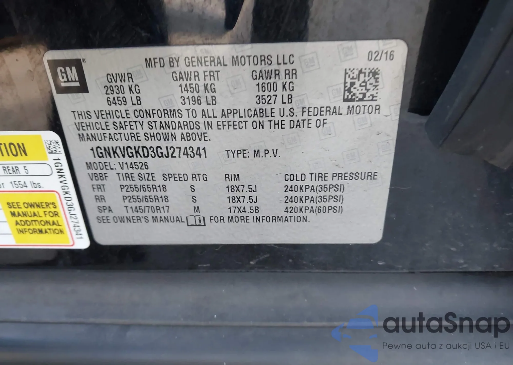 LOT: 43543868 VIN: 1GNKVGKD3GJ274341