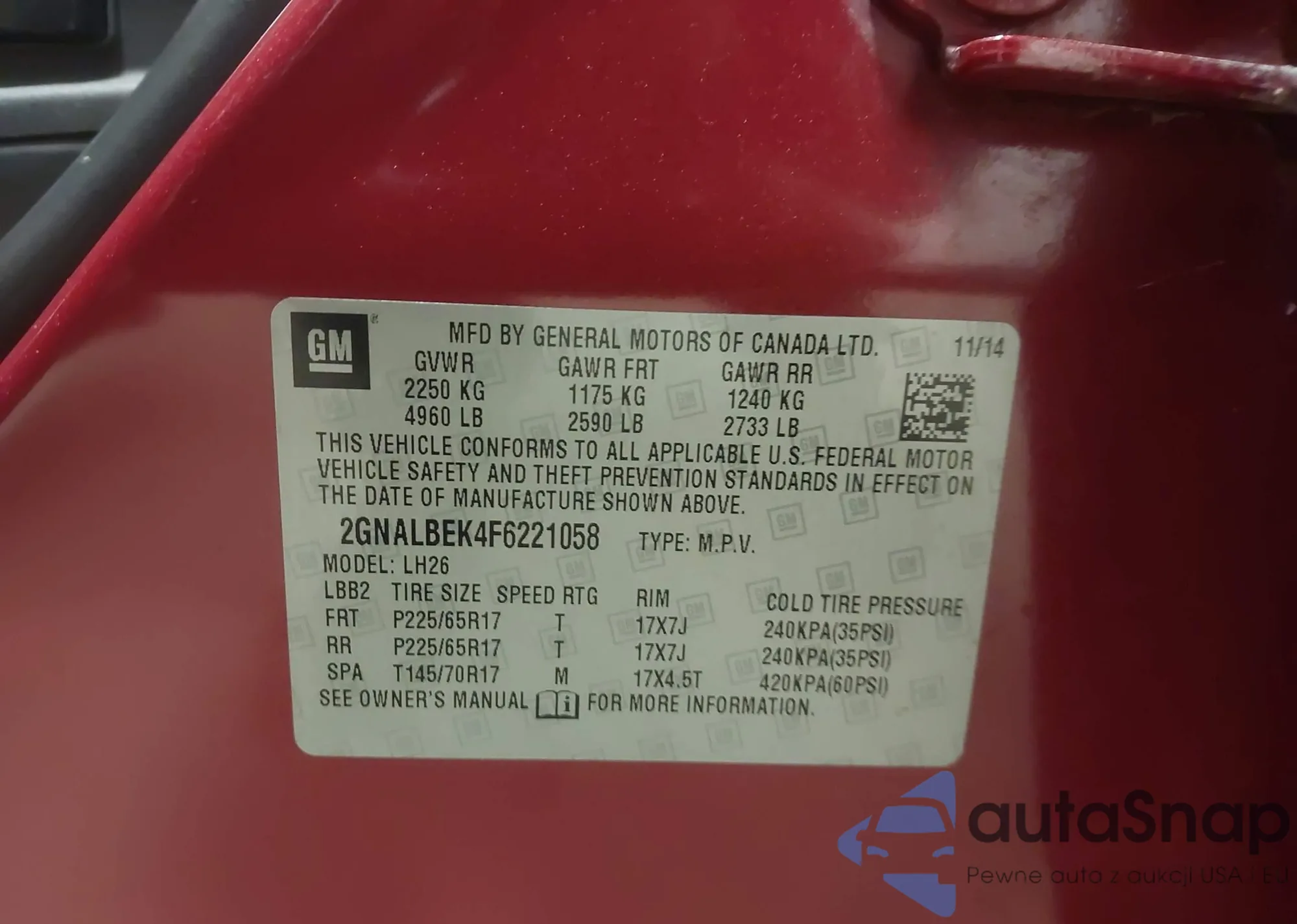 • VIN 2GNALBEK4F6221058