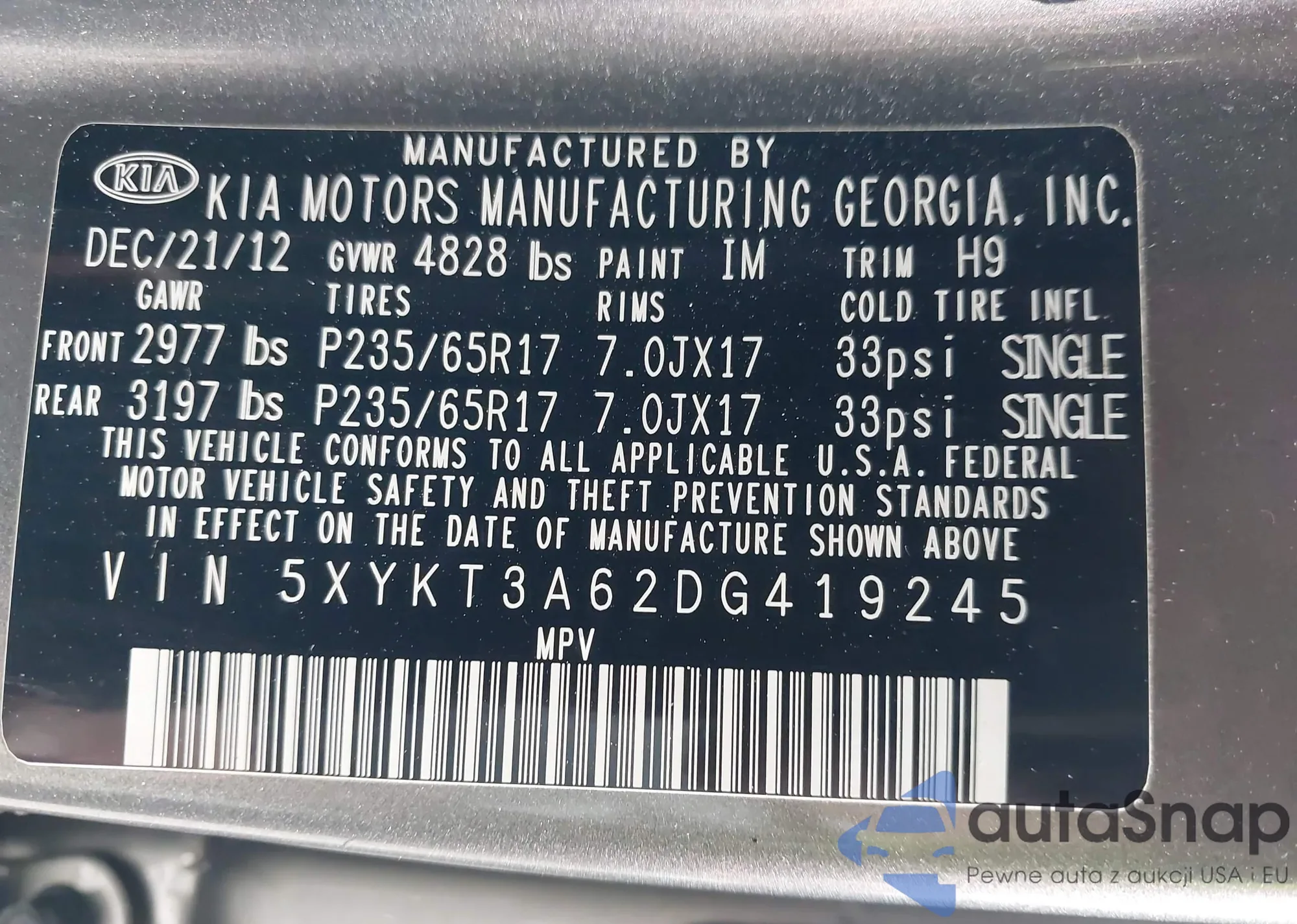 • VIN 5XYKT3A62DG419245