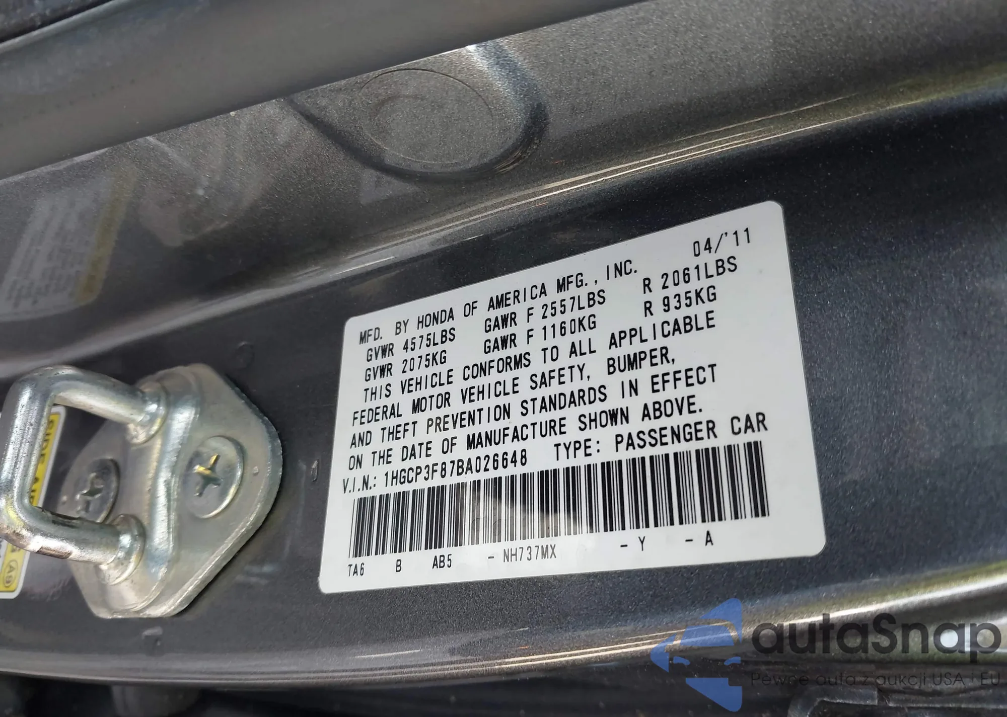 LOT: 44193725 VIN: 1HGCP3F87BA026648