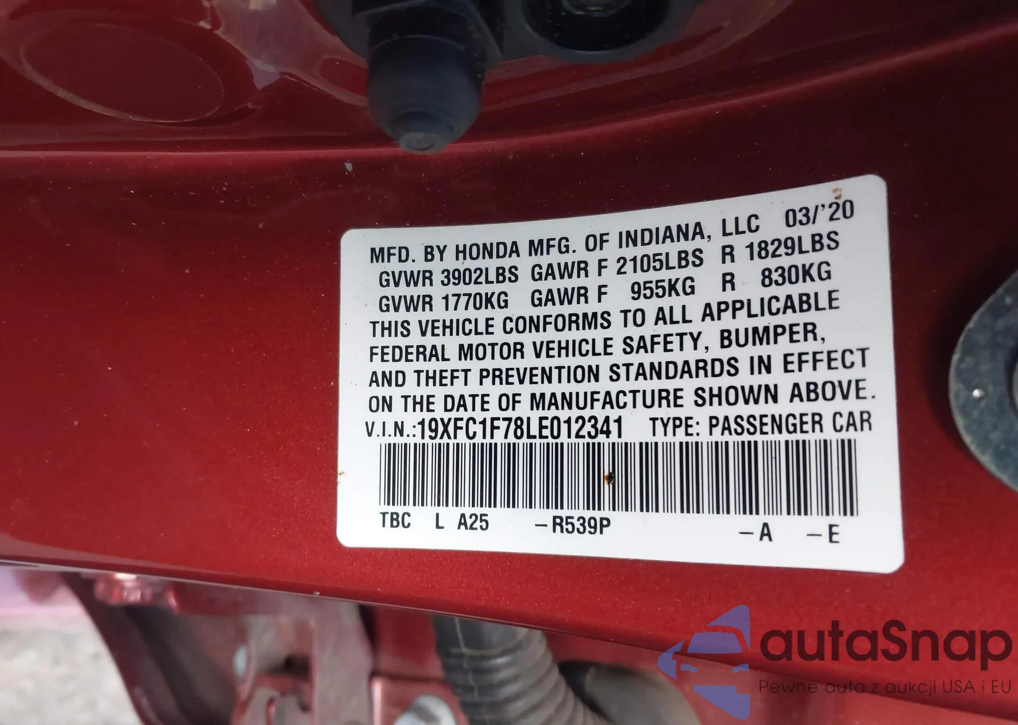 LOT: 43907439 VIN: 19XFC1F78LE012341
