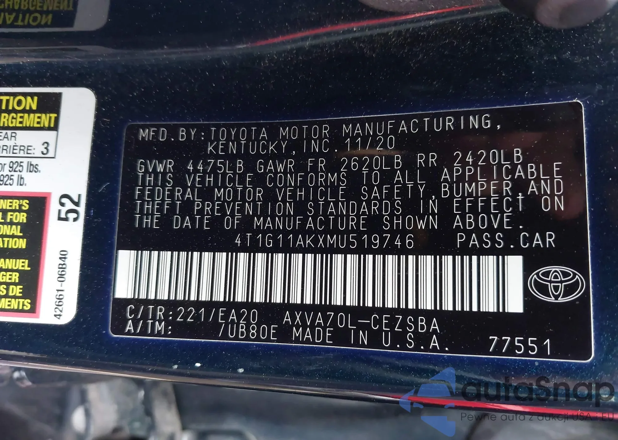 LOT: 43773959 VIN: 4T1G11AKXMU519746