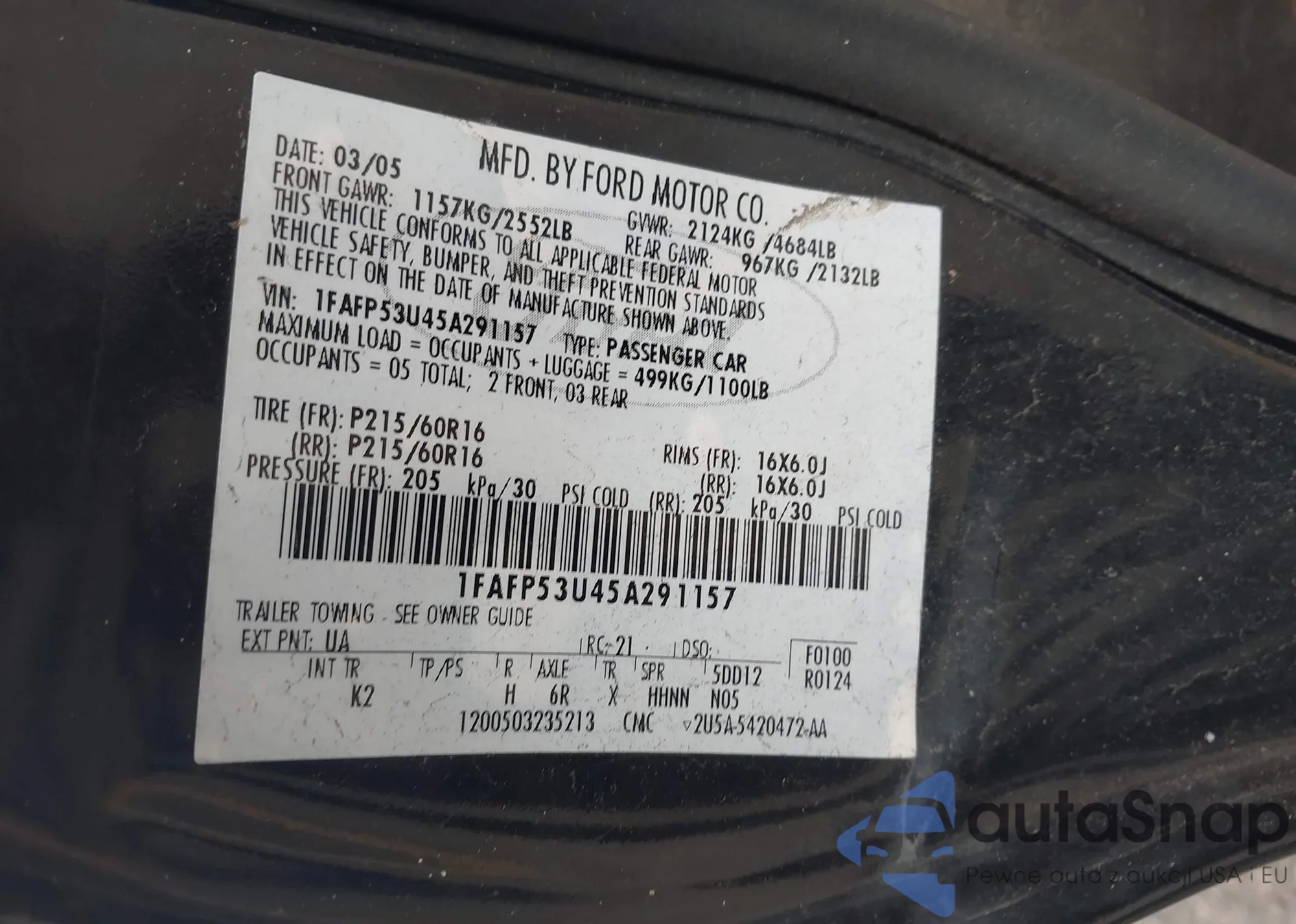 LOT: 44122511 VIN: 1FAFP53U45A291157
