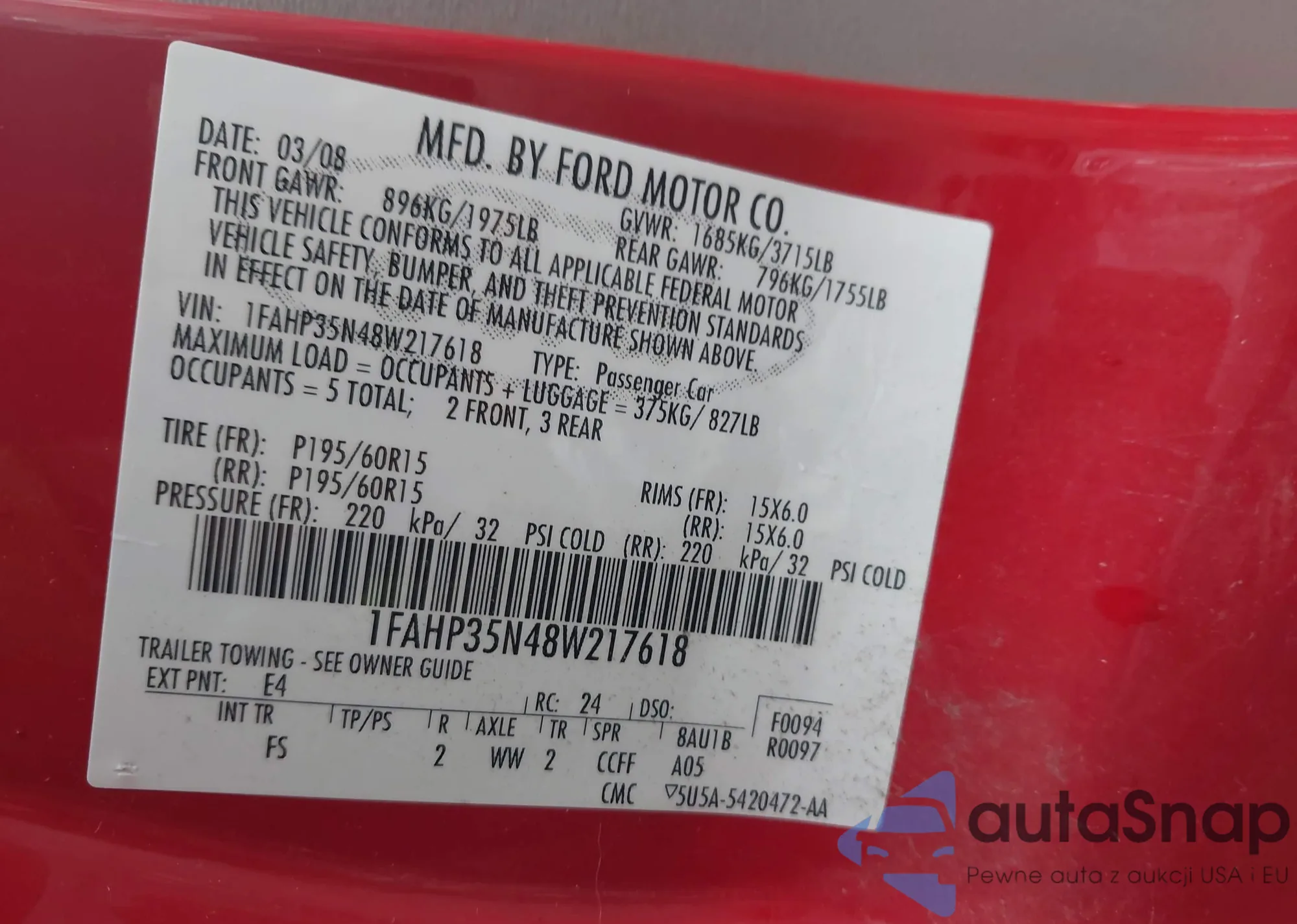 LOT: 43887217 VIN: 1FAHP35N48W217618