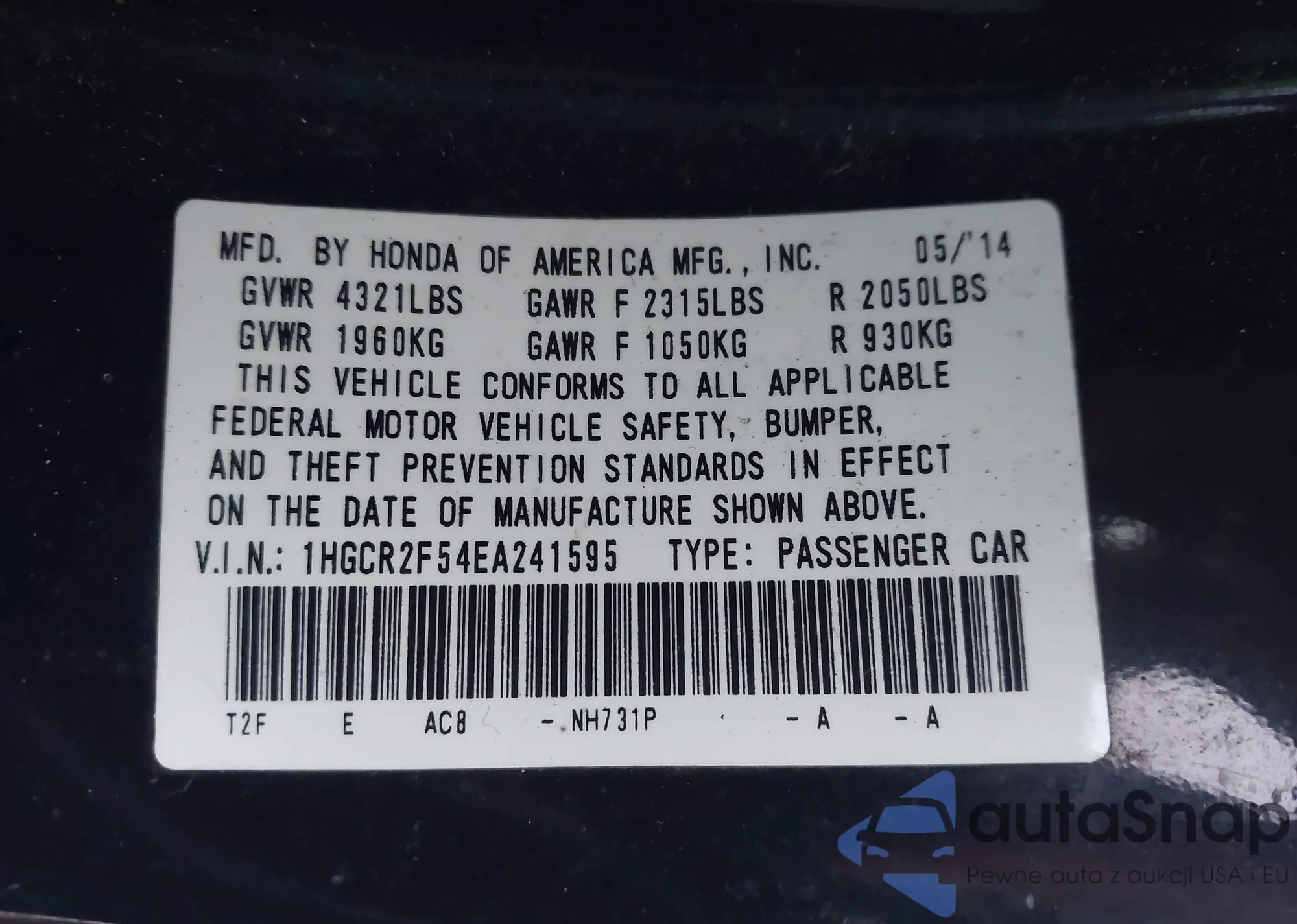 • VIN 1HGCR2F54EA241595
