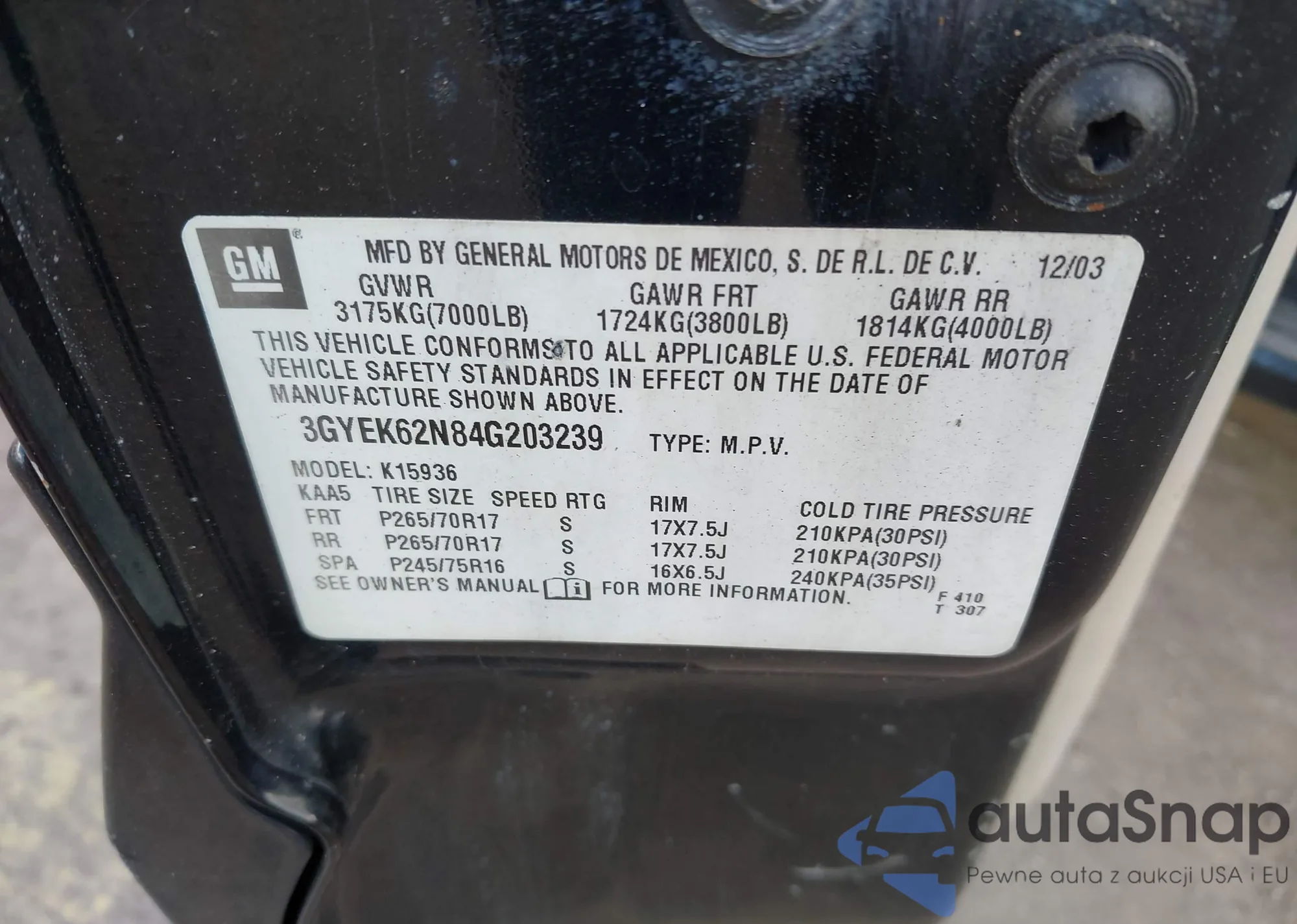 • VIN 3GYEK62N84G203239