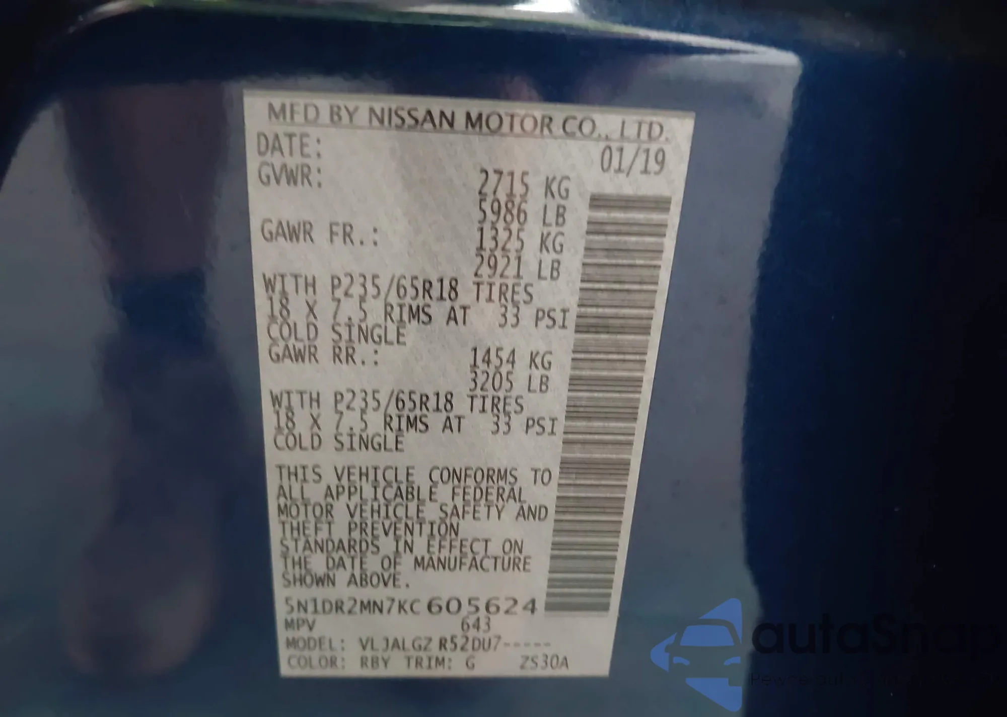 • VIN 5N1DR2MN7KC605624