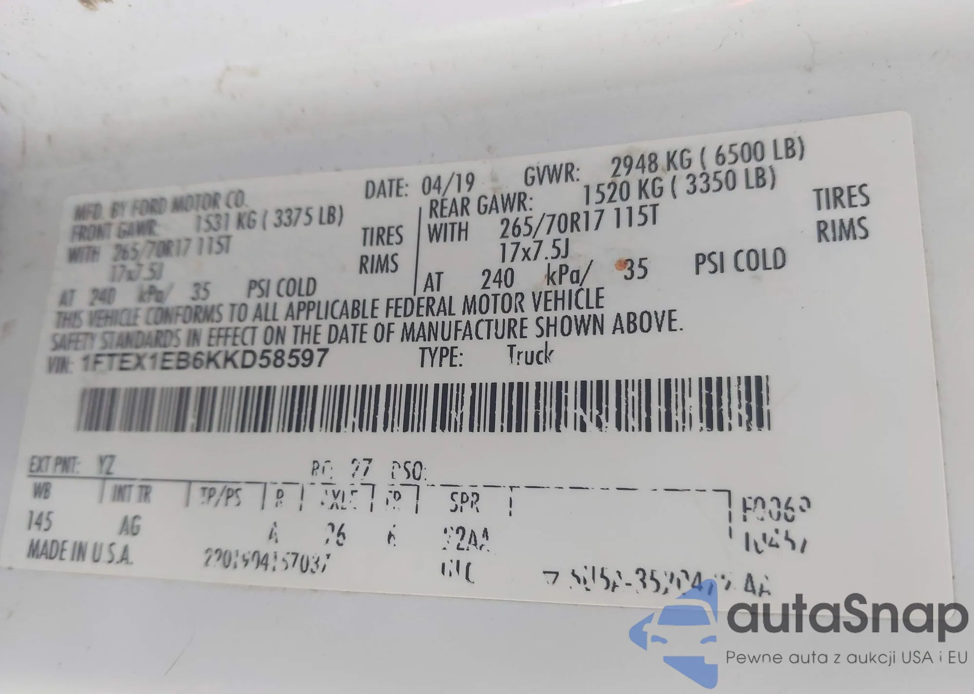 LOT: 44085747 VIN: 1FTEX1EB6KKD58597