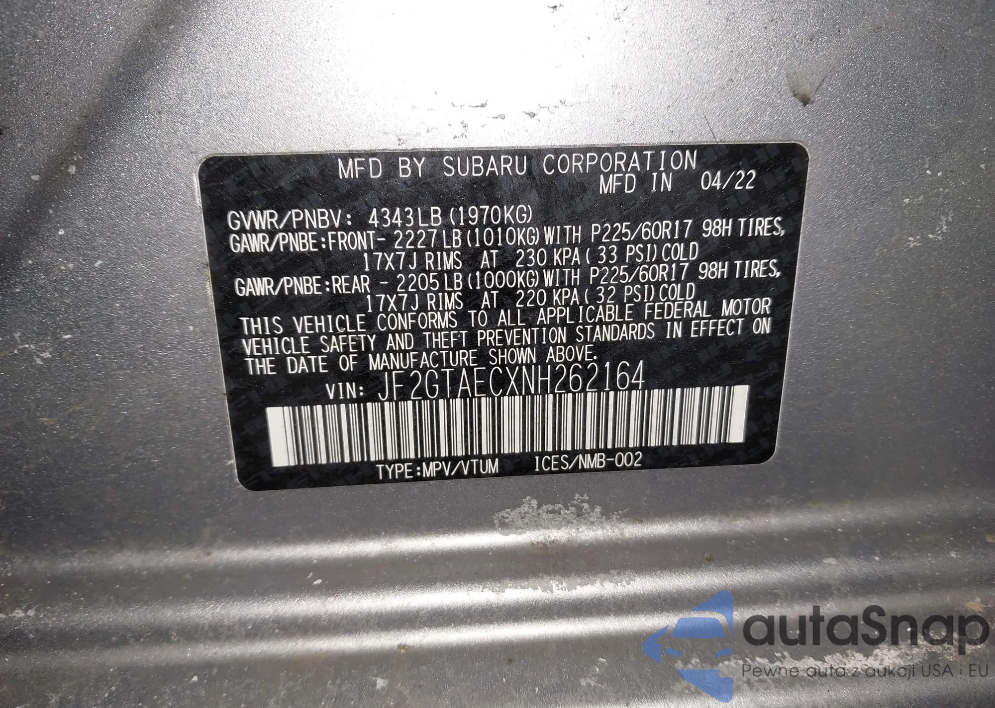 • VIN JF2GTAECXNH262164
