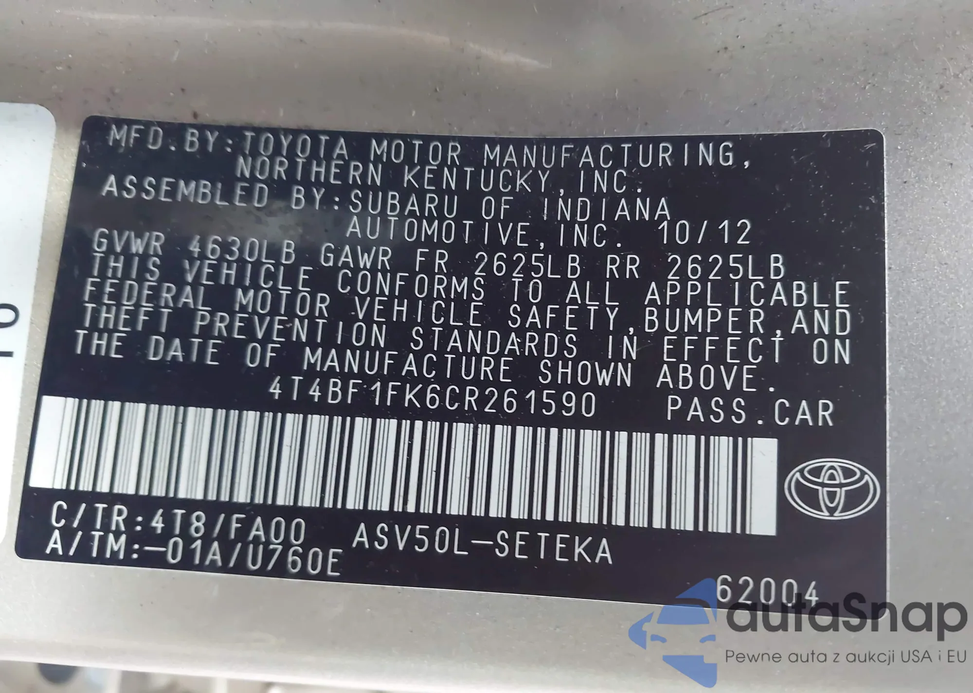 • VIN 4T4BF1FK6CR261590