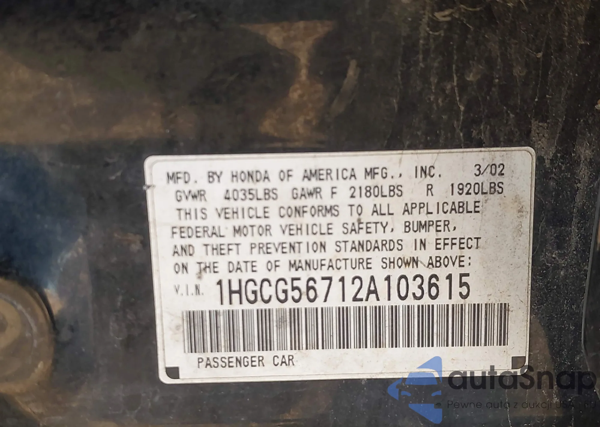 LOT: 43823152 VIN: 1HGCG56712A103615
