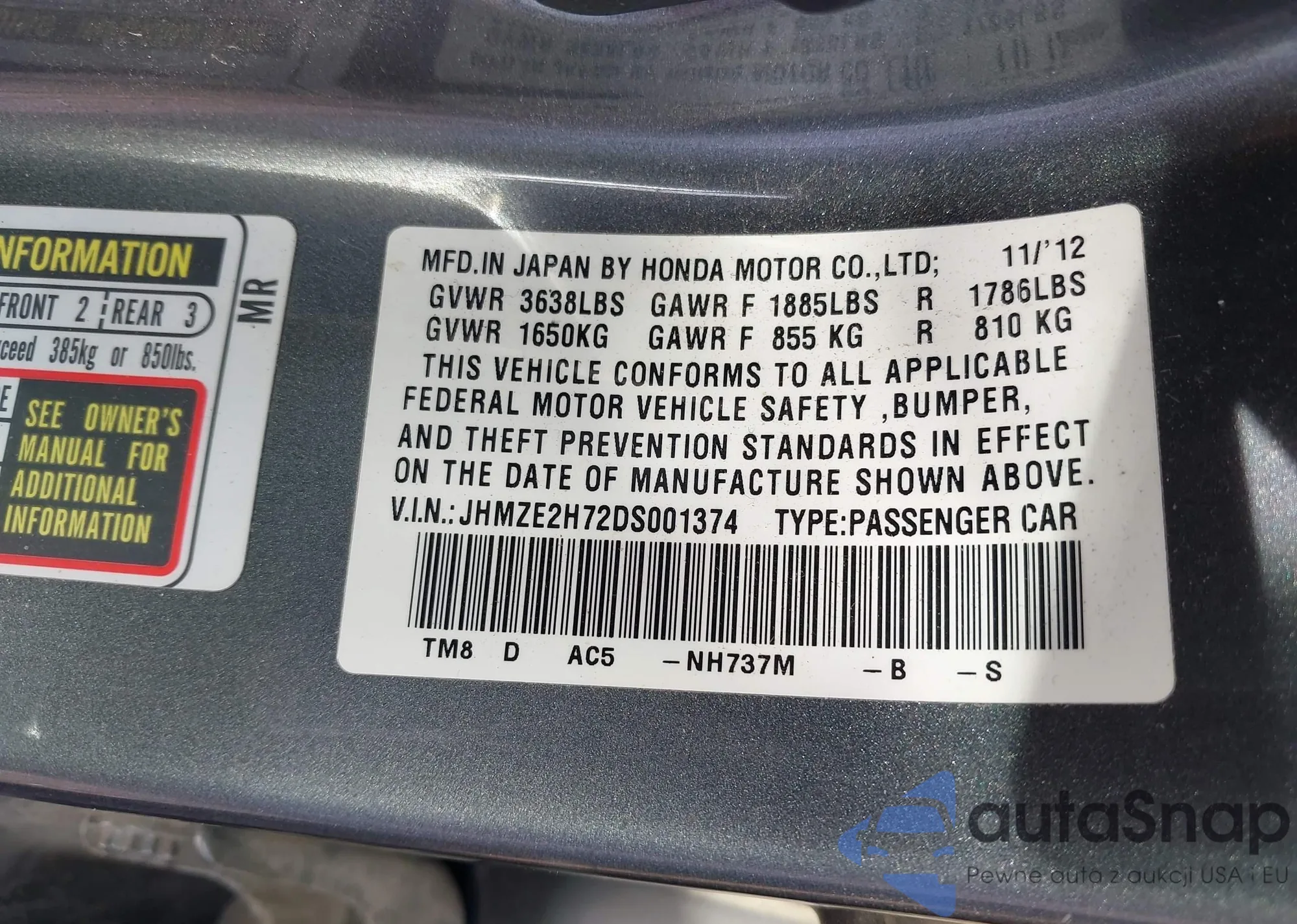 LOT: 43967249 VIN: JHMZE2H72DS001374