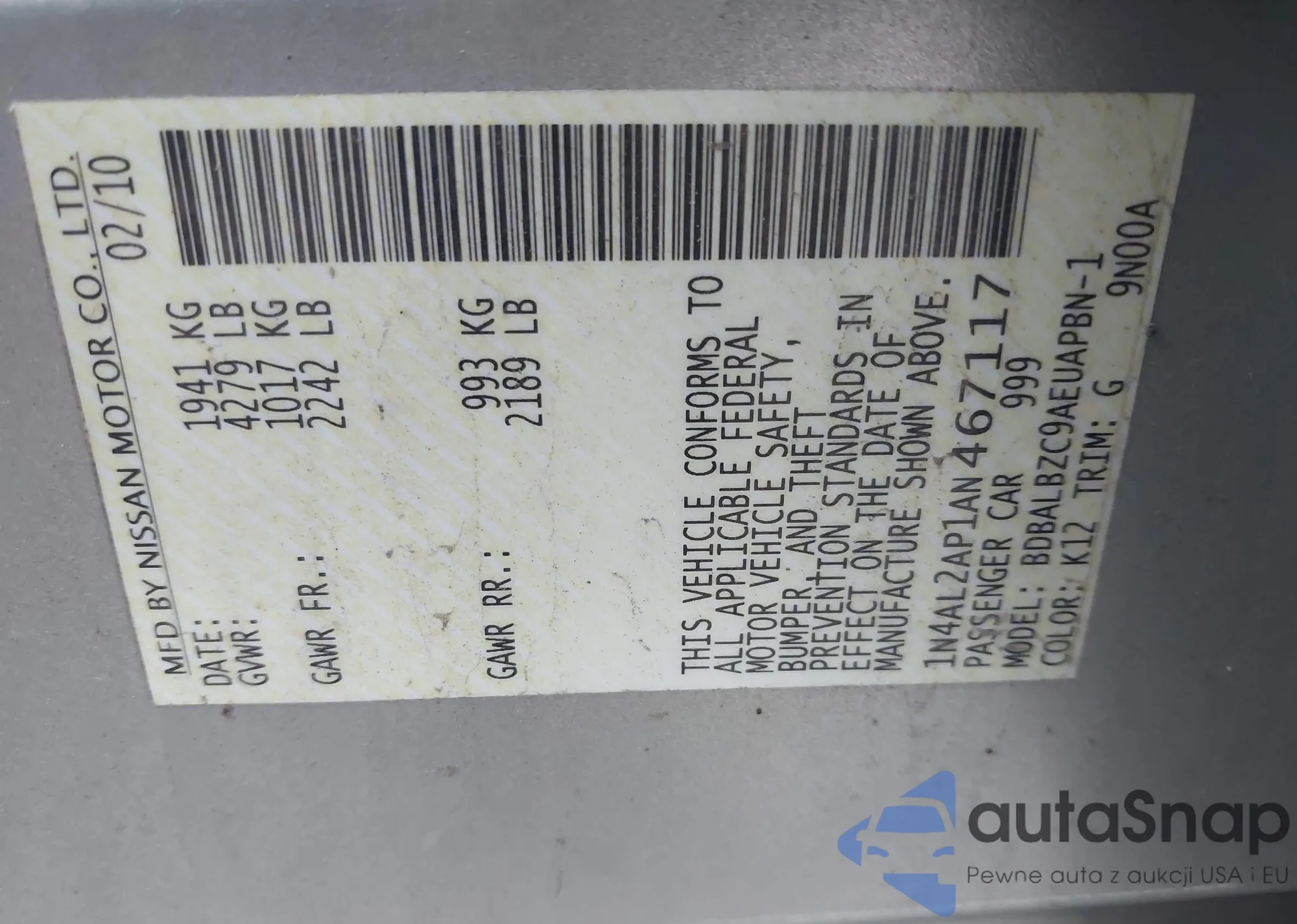 LOT: 44000749 VIN: 1N4AL2AP1AN467117