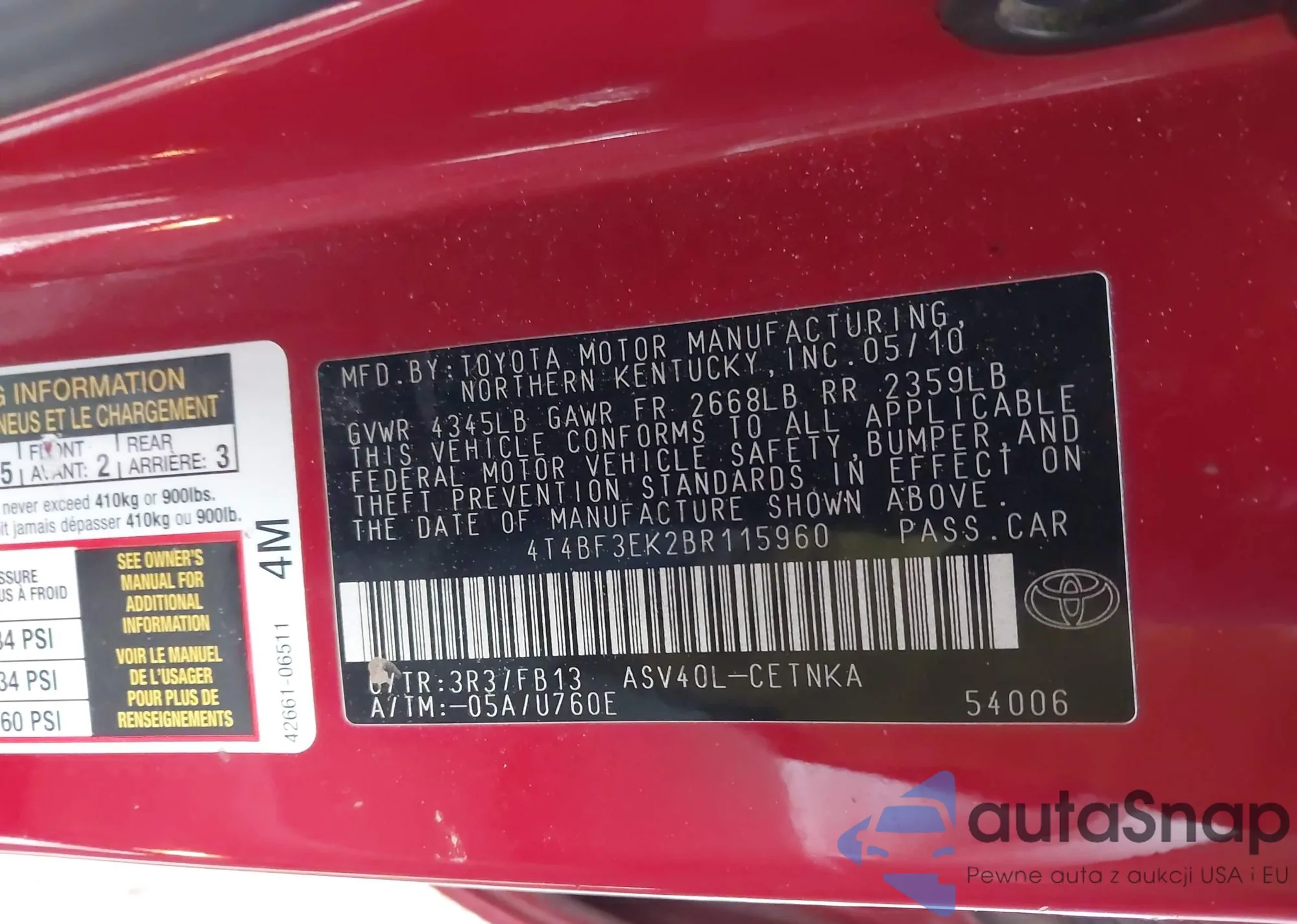 • VIN 4T4BF3EK2BR115960