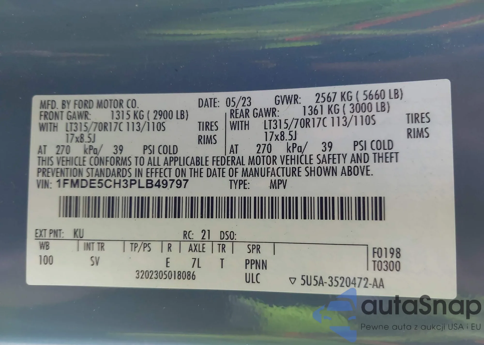 LOT: 43897006 VIN: KNDPUCAF8P7036110