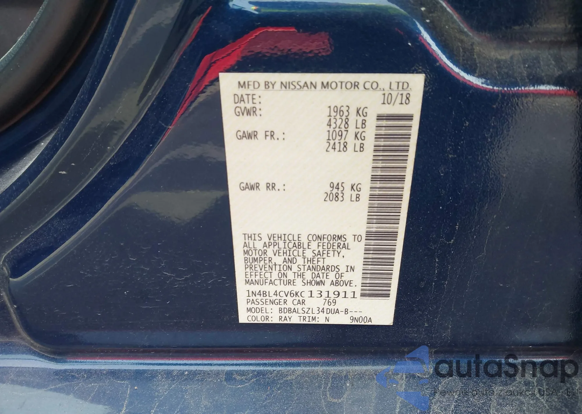 LOT: 43936722 VIN: 1N4BL4CV6KC131911