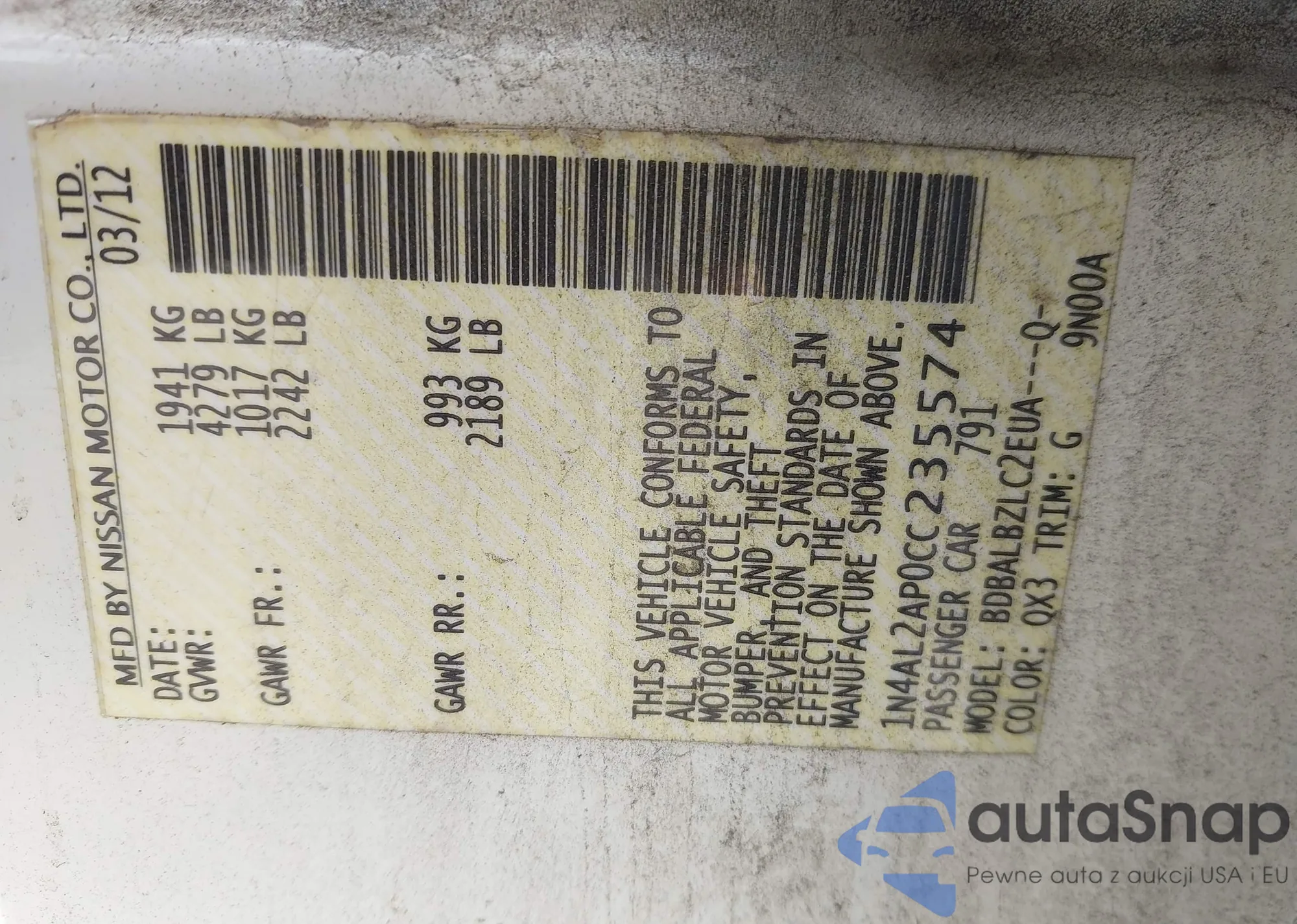 LOT: 44053841 VIN: 1N4AL2AP0CC235574