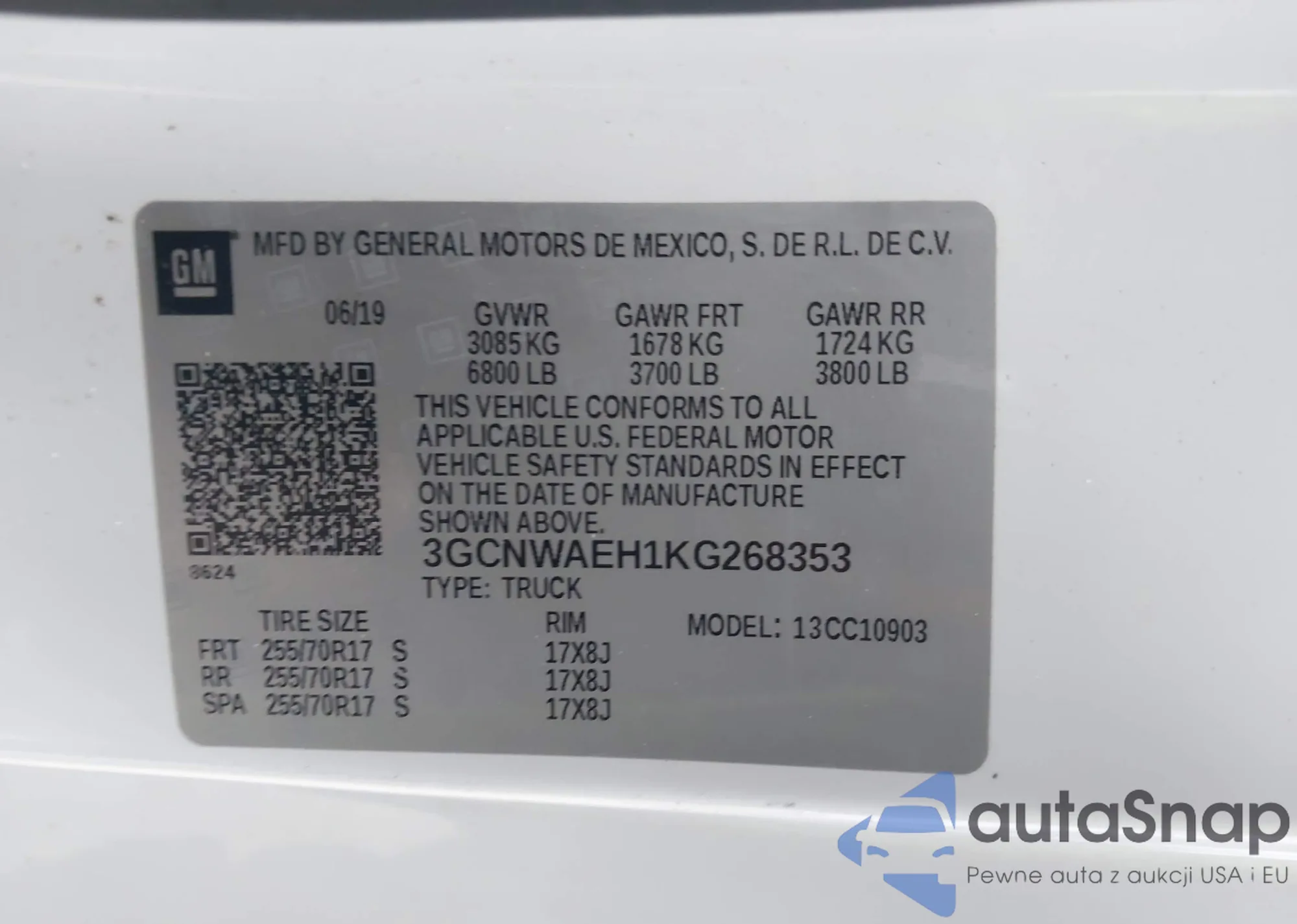• VIN 3GCNWAEH1KG268353