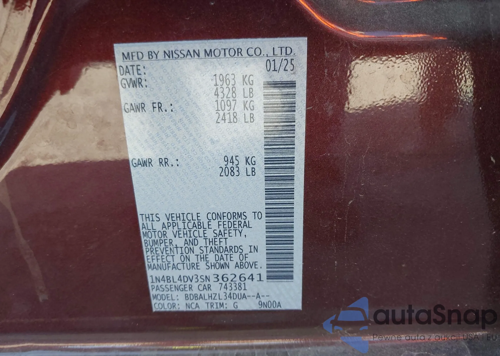 • VIN 1N4BL4DV3SN362641