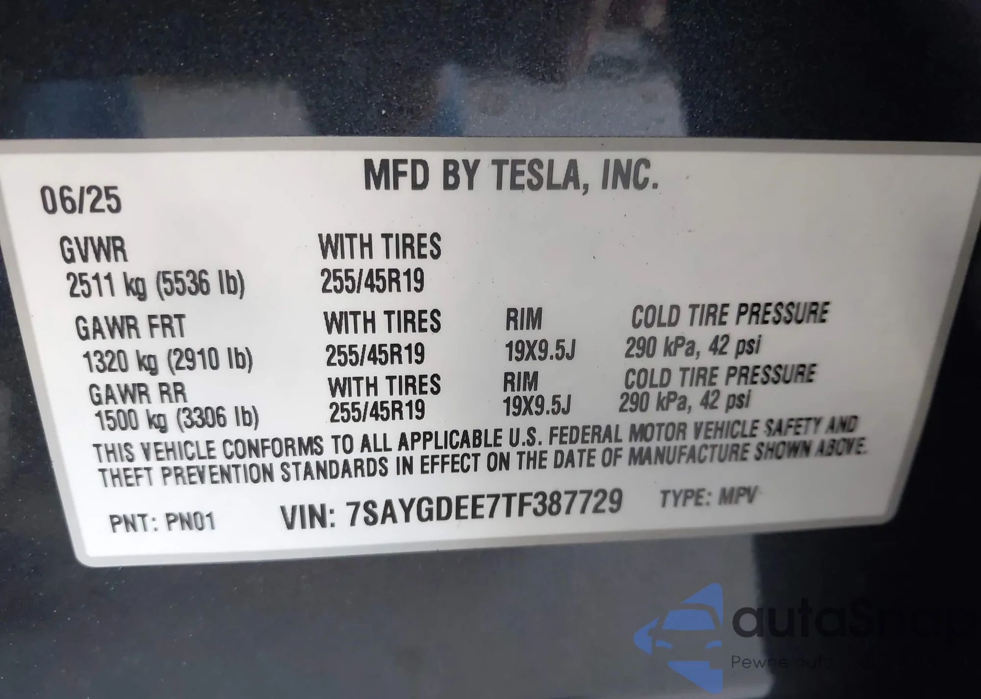 • VIN 7SAYGDEE7TF387729